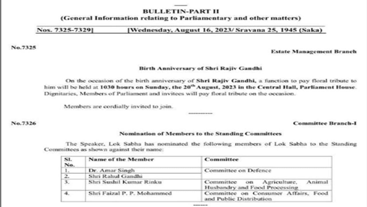 காங்கிரஸிலிருந்து இருவர், தேசியவாத காங்கிரஸ், ஆம் ஆத்மி கட்சிகளில் இருந்து தலா ஒருவர் என நான்கு எதிர்க்கட்சி எம்.பி.க்களை வெவ்வேறு நாடாளுமன்ற நிலைக் குழுக்களுக்கு சபாநாயகர் பரிந்துரை செய்துள்ளார். அதன்படி, பாதுகாப்பு நிலைக்குழு உறுப்பினராக ராகுல் காந்தி எம்.பி.யின் பெயர் பரிந்துரை செய்யப்பட்டுள்ளது. கடந்த மார்ச் மாதம் தகுதி நீக்கம் செய்யப்படுவதற்கு முன்பு வரை அவர் அக்குழுவில் இடம்பெற்றிருந்தார் என்பது கவனிக்கத்தக்கது.