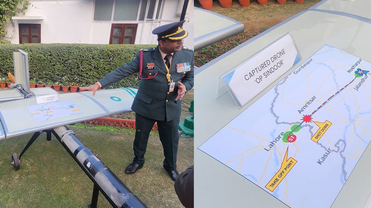 இந்திய இராணுவத்தின் ‘ஆபரேஷன் சிந்தூர்’ நடவடிக்கையின் போது சுட்டு வீழ்த்தப்பட்ட பாகிஸ்தான் டிரோன் முதல் முறையாகக் காட்சிப்படுத்தப்பட்டுள்ளது.இந்த 'YIHA' டிரோன் துருக்கியில் தயாரிக்கப்பட்டது.
