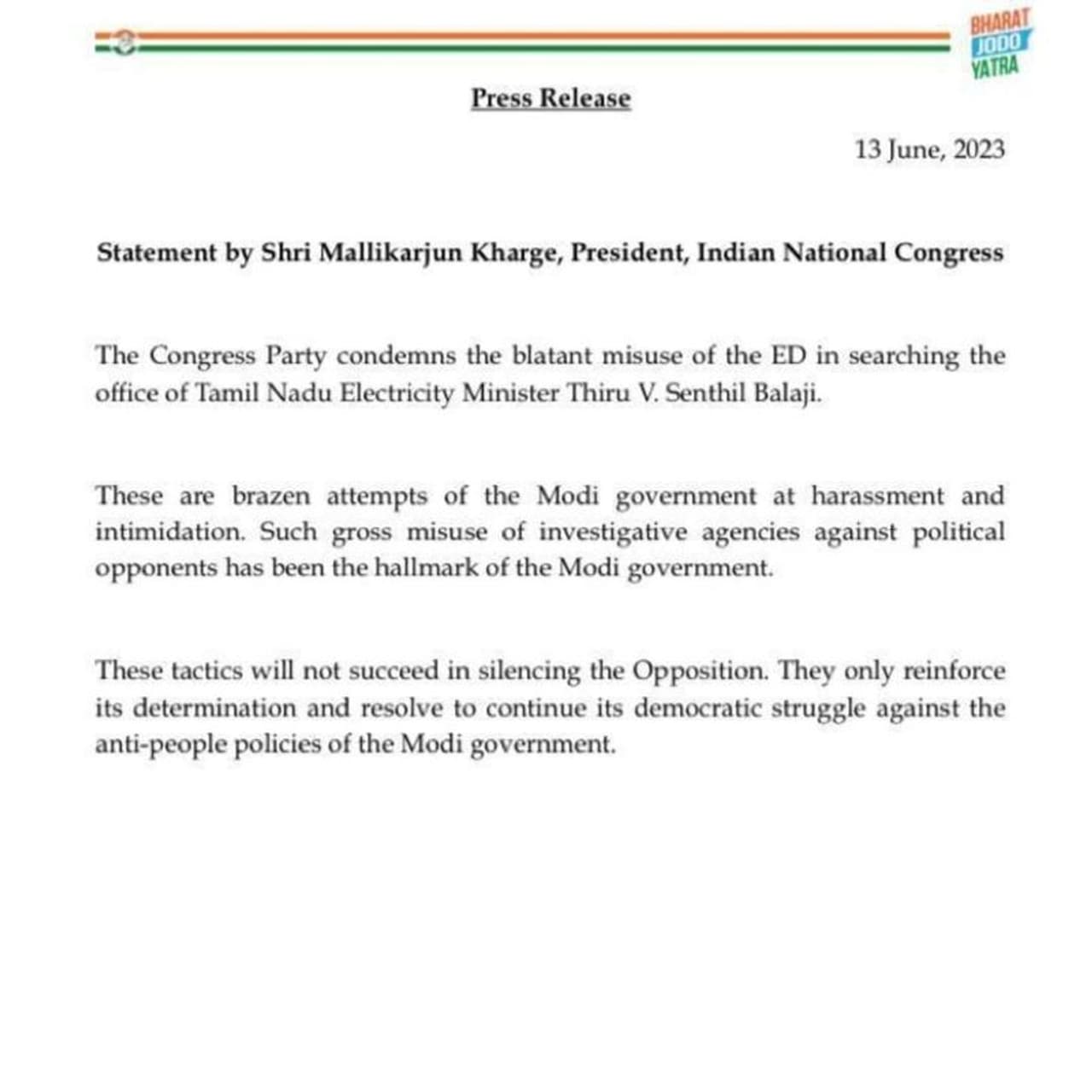 காங்கிரஸ் தலைவர் மல்லிகார்ஜுன கார்கே, அமைச்சர் செந்தில் பாலாஜிக்கு தொடர்பான இடங்களில் நடைபெறும் சோதனைக்கு காங்கிரஸ் தலைவர் மல்லிகார்ஜுன கார்கே கண்டனம் தெரிவிப்பதாகவும், எதிர்க்கட்சிகளின் வாயை அடைக்கும் மோடி அரசின் யுத்தி வெற்றி பெறாது என்றும் காட்டமாக கூறியுள்ளார் மல்லிகார்ஜுன கார்கே.