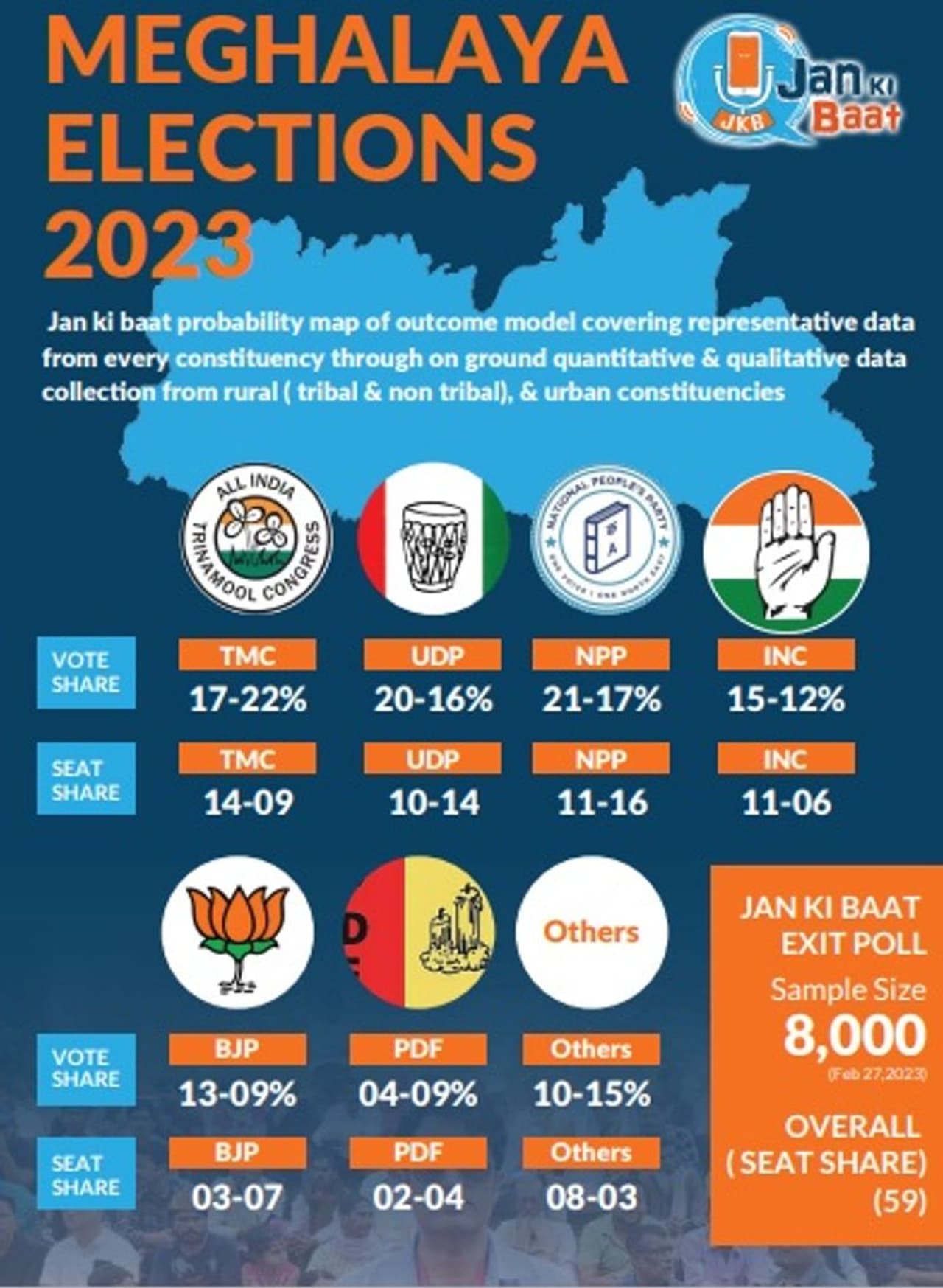 இந்நிலையில், மேகாலயா சட்டப்பேரவைத் தேர்தல் வாக்குப்பதிவு முடிவடைந்ததைத் தொடர்ந்து, வாக்குப்பதிவுக்குப் பிந்தைய கருத்துக்கணிப்புகள் வெளியாகியுள்ளன.