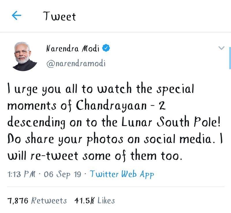 கோடிக்கணக்கான இந்தியர்களுக்கு பயனளிக்க உள்ளது சந்திராயன் 2. இந்த நிகழ்வை நாட்டு மக்கள் அனைவரும் காண வேண்டும்" என்று வேண்டுகோள் விடுத்துள்ளார்.