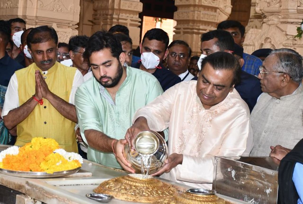 அவர்களை கோவில் அறக்கட்டளையின் தலைவர் லஹிரி, செயலாளர் ஸ்ரீ யோகேந்திரபாய் தேசாய் போன்றோர் வரவேற்றனர். முகேஷ் அம்பானி மற்றும் ஆகாஷ் அம்பானி ஆகியோர் தெய்வத்தின் முன் அபிஷேகம் செய்து பிரார்த்தனை செய்தனர்.