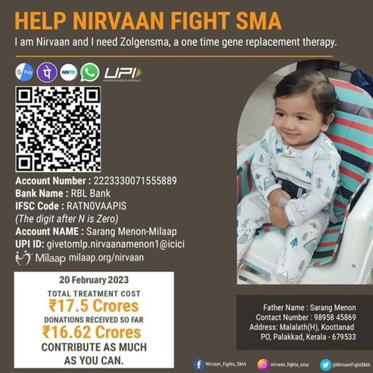 இதற்கிடையில், நிர்வானின் குடும்பத்தினர் ஃபேஸ்புக்கில், நிர்வானின் SMA சிகிச்சைக்கான உங்கள் அசைக்க முடியாத ஆதரவு, பிரார்த்தனை மற்றும் பங்களிப்புகளுக்கு உங்கள் அனைவருக்கும் நாங்கள் நன்றியுள்ளவர்களாக இருப்போம். எங்கள் குடும்பத்தின் மீதான உங்கள் இரக்கமும் கருணையும், SMA க்கு எதிரான எங்கள் மகனின் போராட்டத்திற்காக தொடர்ந்து போராட எங்களுக்கு பலத்தை அளித்துள்ளது. உங்கள் அனைவருடனும் ஒரு நல்ல செய்தியைப் பகிர்ந்து கொள்ள விரும்புகிறோம். பெயர் சொல்லாத நபர் ஒருவரிடம் இருந்து 1.4 மில்லியன் டாலர் நன்கொடையைப் பெற்றுள்ளோம். அவர்களின் பெருந்தன்மை நிர்வானின் சிகிச்சைக்குத் தேவையான நிதியைத் திரட்டும் எங்கள் இலக்கை நெருங்கிவிட்டது. தேவையில் இருக்கும் மற்றவர்களுக்கு உதவ தன்னலமின்றி முன்வரும் தேவதைகள் உலகில் இன்னும் இருக்கிறார்கள் என்பதை அறிவது மனதிற்கு இதமாக இருக்கிறது. நிர்வானுக்கு இன்னும் நீண்ட பாதை இருப்பதால், அவர் விரைவில் குணமடைய தொடர்ந்து பிரார்த்தனை செய்யுமாறு உங்கள் அனைவரையும் கேட்டுக்கொள்கிறேன். ஆனால் இப்போதைக்கு, இந்த அற்புதமான செய்தியையும், அதை சாத்தியமாக்கிய நன்கொடையாளரின் கருணையையும் கொண்டாட சிறிது நேரம் ஒதுக்குங்கள் என்று குறிப்பிட்டுள்ளனர்.