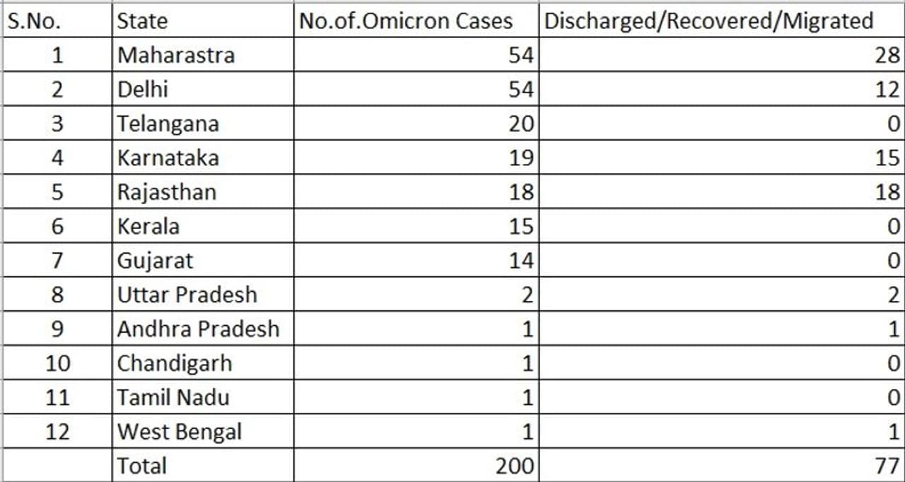 இந்த 200 பேரில் 77 பேர் குணமடைந்து அல்லது வேறு நாடுகளுக்குச் சென்றுவிட்டனர். இதில் அதிகபட்சமாக டெல்லி, மகாராஷ்டிராவில் தலா 54 பேர் ஒமைக்ரானால் பாதிக்கப்பட்டுள்ளனர். அதைத் தொடர்ந்து தெலங்கானா (20), கர்நாடகா (19), ராஜஸ்தான் (18), கேரளா (15) குஜராத் (14) பேர் பாதிக்கப்பட்டுள்ளனர். கடந்த 24 மணி நேரத்தில் இந்தியாவில் புதிதாக 5,326 பேர் கொரோனாவால் பாதிக்கப்பட்டுள்ளனர். கடந்த 581 நாட்களில் இது மிகக் குறைவாகும். இதுவரை இந்தியாவில் 3.48 கோடி பேர் கொரோனாவால் பாதிக்கப்பட்டுள்ளனர். 79 ஆயிரம் பேர் கொரோனா சிகிச்சையில் உள்ளனர். கடந்த 24 மணி நேரத்தில் 453 பேர் கொரோனாவால் உயிரிழந்துள்ளனர்.