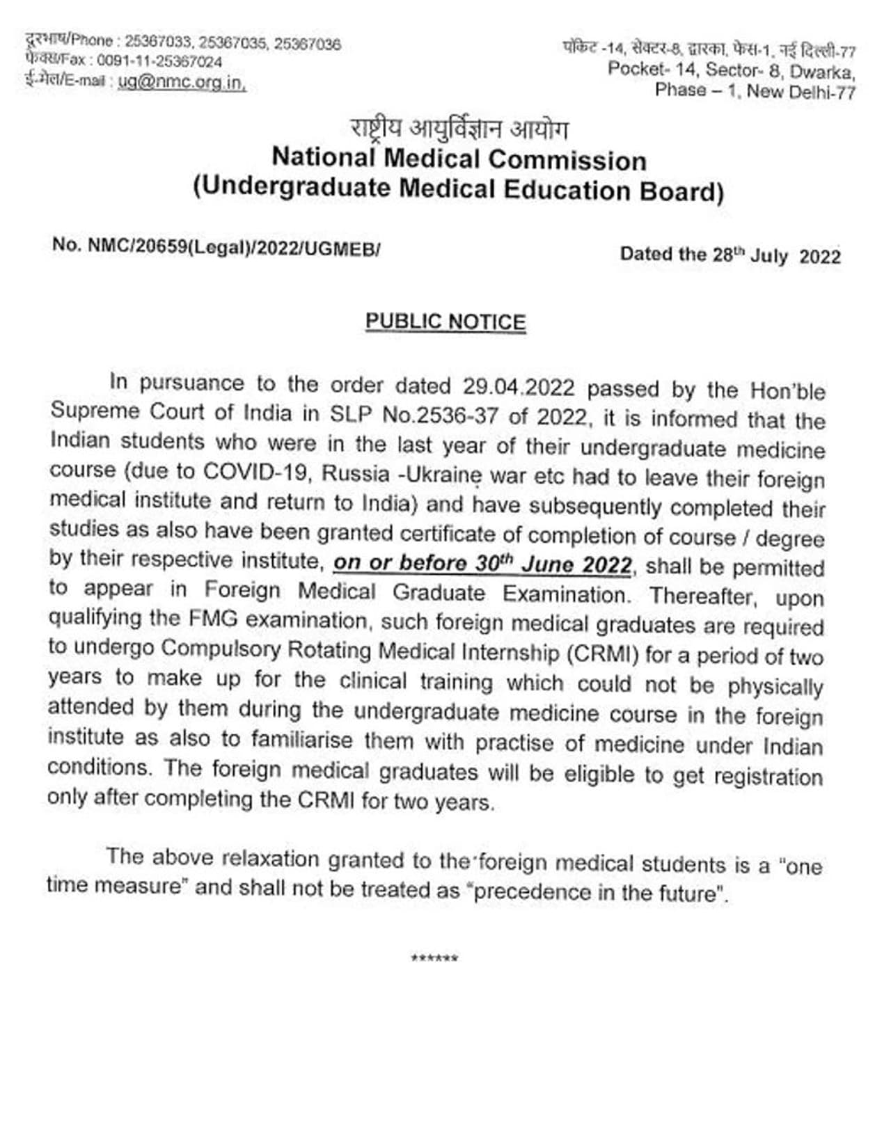 இதுகுறித்து வெளியிடப்பட்ட செய்திக் குறிப்பில், 29.04.2022 நாளன்று வழங்கப்பட்ட உச்சநீதிமன்ற தீர்ப்பின் அடிப்படையில், ரஷ்யா படையெடுப்பால், கடந்தாண்டு உக்ரைன் நாட்டில் இளநிலை மருத்துவப் படிப்புகளில் படித்து வந்த இந்திய மருத்துவ மாணவர்கள், ரஷ்யா படையெடுப்பால் இந்தியாவுக்கு திரும்பி, அதன் பின் மருத்துவப் படிப்பை முடித்ததற்கான சான்றிதழ் பெற்ற மாணவர்கள், FMGE எனப்படும் அயல்நாட்டு மருத்துவ தணிக்கைத் தேர்வுக்கு அனுமதிக்கப்பட உள்ளனர். இத்தேர்வுக்கு தகுதி பெற, 2022, ஜுன் 30 அன்றோ (அ) அதற்கு முன்பாகவோ மருத்துவப் படிப்பை முடித்ததற்கான சான்றிதழை மாணவர்கள் பெற்றிருக்க வேண்டும். தேர்ச்சி பெற்ற மாணவர்கள், இந்தியாவில் மருத்துவம் பார்ப்பதற்கு இரண்டு Compulsory Rotating Medical Internship என்ற பயிற்சி காலத்தை இந்தியாவில் நிறைவு செய்ய அனுமதிக்கப்படுவார்கள். ஈராண்டுகள் பயிற்சி முடித்த மாணவர்கள் மட்டுமே இந்தியாவில் மருத்துவராக பதிவு செய்து மருத்துவம் பார்க்க முடியும் என்று தெரிவிக்கப்பட்டுள்ளது.