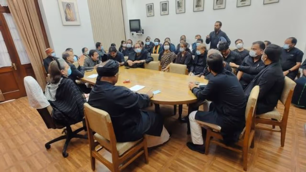 ராகுல் தகுதி நீக்கத்தை கண்டித்து டி.ஆர்.பாலு உள்ளிட்ட அனைத்து எதிர்கட்சி எம்.பிக்களும் கருப்பு சட்டையுடன் நாடாளுமன்றம் சென்றனர்.