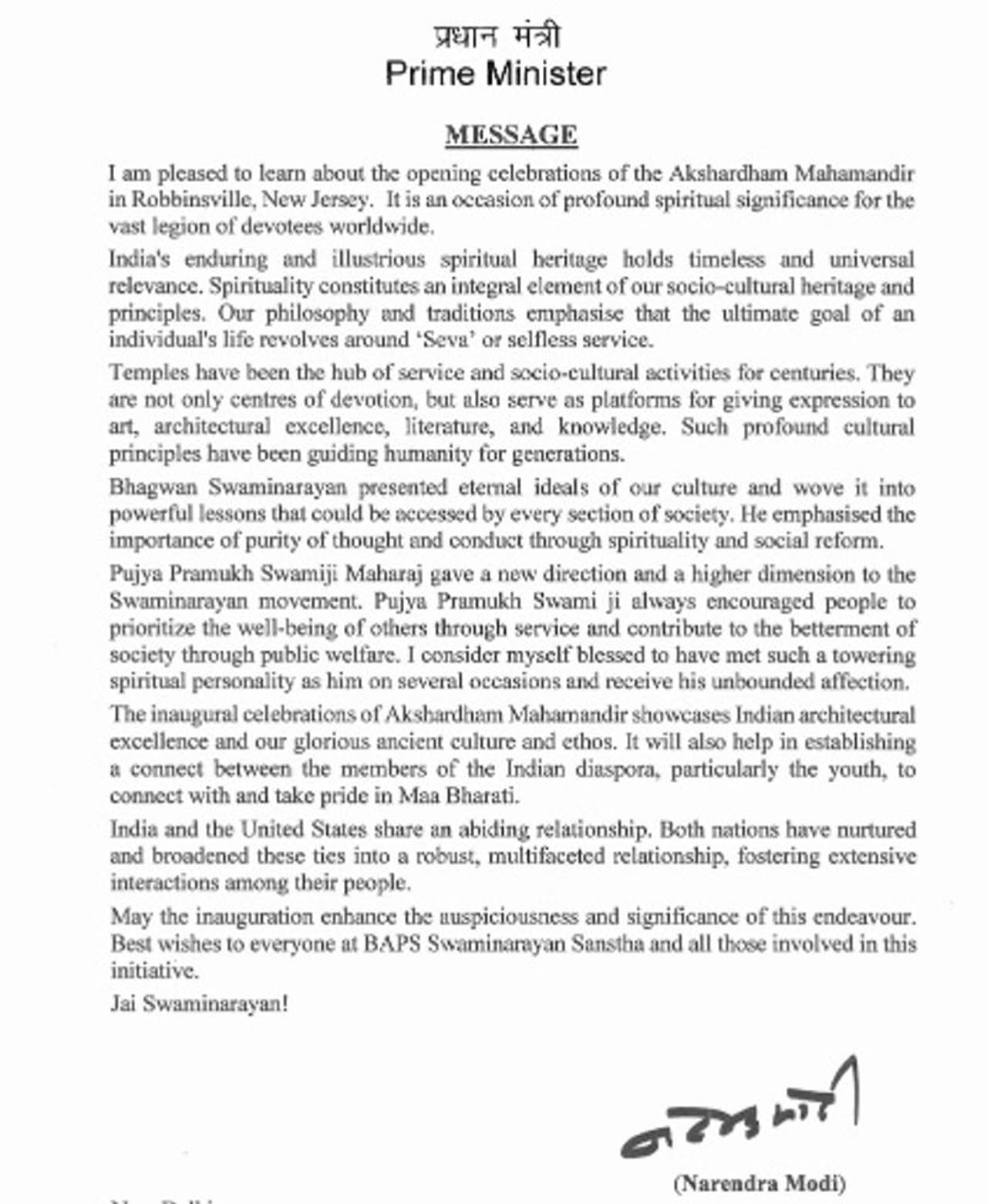 நியூஜெர்சியில் உள்ள ராபின்ஸ்வில்லேவில் நடைபெற்ற தொடக்க விழாவுக்கான தனது கடிதத்தில் பிரதமர் மோடி, ''கோயில்கள் பல நூற்றாண்டுகளாக சேவை மற்றும் சமூக-கலாச்சார நடவடிக்கைகளின் மையமாக இருந்து வருகின்றன. அவை பக்தி மையங்கள் மட்டுமல்ல, கலை, கட்டிடக்கலை ஆகியவற்றை வெளிப்படுத்துவதற்கான தளங்களாகவும் செயல்படுகின்றன. இத்தகைய ஆழமான கலாச்சாரக் கோட்பாடுகள் மனிதகுலத்தை வழிநடத்தி வருகின்றன.