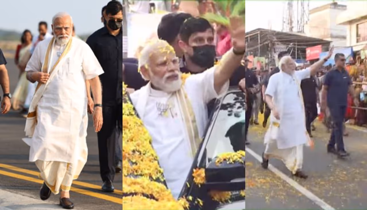 பிரதமர் மோடி தனது வாகனத்தில் இருந்து இறங்கி, மக்களின் இருப்பு மற்றும் ஆதரவுக்காக மக்களை நோக்கி கை அசைத்து நடக்க தொடங்கினார். அவர் கேரளா பாணியில் பாரம்பரிய முறையில் வெள்ளை சட்டை மற்றும் வேட்டை அணிந்திருந்தது அனைவரையும் கவர்ந்தது.