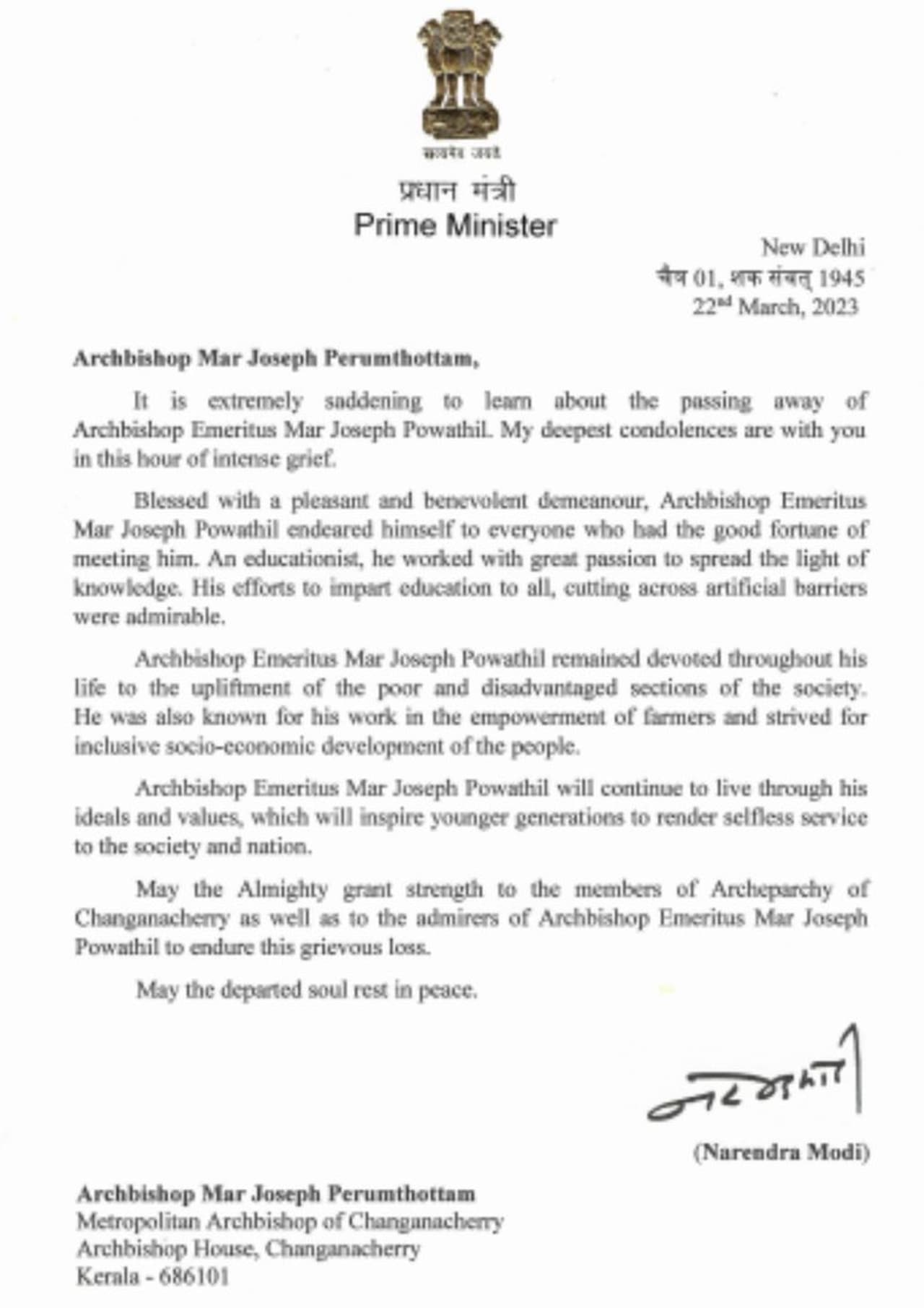 எமரிட்டஸ் பேராயர் மார் ஜோசப் பொவத்தில் மறைந்ததற்கு பிரதமர் நரேந்திர மோடி இரங்கல் தெரிவித்துள்ளார்.