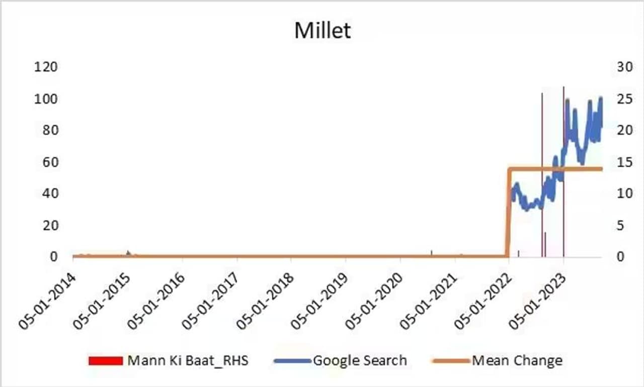 2022 ஆம் ஆண்டின் தொடக்கத்தில் சிறுதானியங்கள் குறித்து கூகிளில் மிகக் குறைவான தேடல்களே இருந்தது. மேலும் மன் கி பாத் மூலம் அவை கூடுதல் ஈர்ப்பைப் பெற்றன, முந்தைய சராசரி 0.026லிருந்து 55.77 ஆக அது அதிகரித்தது.