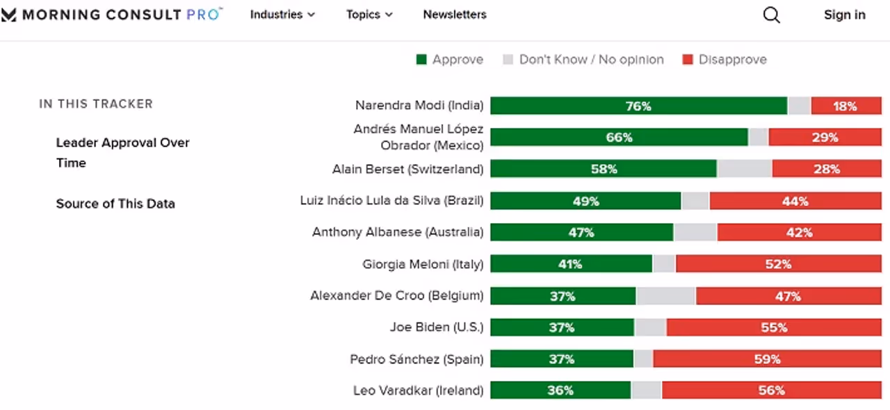 40% க்கும் குறைவான ஒப்புதல் மதிப்பீடுகளுடன் பட்டியலில் உள்ள மற்ற உலகத் தலைவர்கள் ஜோ பிடன், ஸ்பெயின் பிரதமர் பெட்ரோ சான்செஸ், கனேடிய பிரதமர் ஜஸ்டின் ட்ரூடோ, ரிஷி சுனக், பிரெஞ்சு ஜனாதிபதி இம்மானுவேல் மேக்ரான் மற்றும் ஜெர்மனியின் அதிபர் ஓலாஃப் ஸ்கோல்ஸ்.