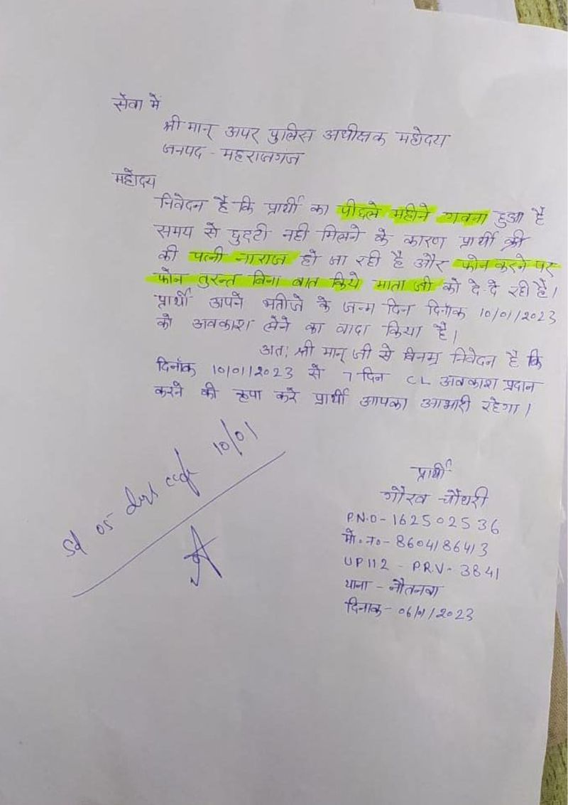 காவல்துறையினர் மற்றும் ராணுவ வீரர்கள் என பலரும், குடும்பத்துடன் தங்களுடைய நேரத்தை குறைவாகவே செலவிடுகிறார்கள். இந்நிலையில் போலீஸ் ஒருவரின் விடுமுறை கடிதம் இணையத்தில் வைரலாகி வருகிறது. அவர் தனது மனைவியின் வீட்டிற்கு செல்ல விடுப்பு கொடுக்கும்படி ஒரு கடிதம் எழுதினார்.