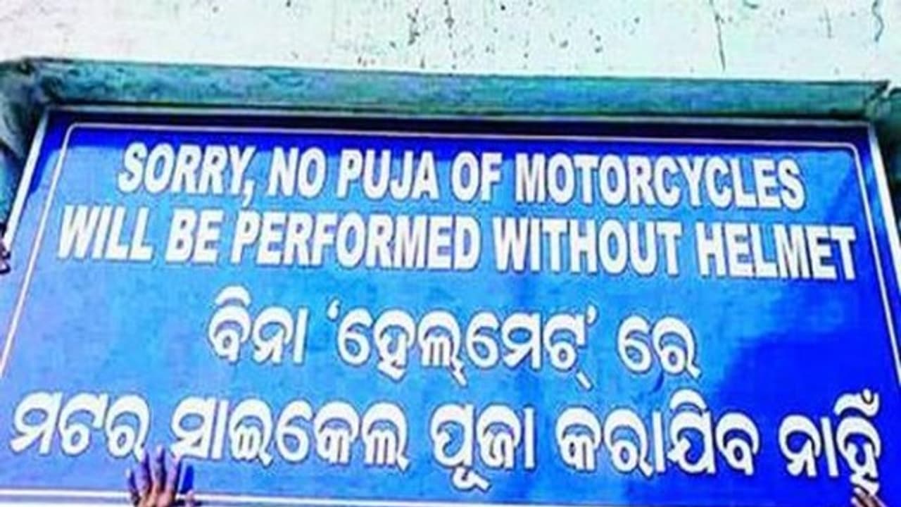 இந்நிலையில் ஒடிசா மாநிலம், புவனேஷ்வரில் உள்ள ஆலய நிர்வகம் ஒன்று சமீபத்தில் ஒரு அறிவிப்புப் பலகையை கோவிலில் வைத்துள்ளது. அதாவது இரு சக்கர வாகன ஓட்டிகள் பூஜை போடுவதற்கு வாகனத்தைக் கொண்டு வரும்போது ஹெல்மெட் கட்டாயம் அணிந்திருக்க வேண்டும். ஹெல்மெட் இல்லையெனில் பூஜை நடத்தப்பட மாட்டாது என அந்த அறிவிப்பில் தெரிவிக்கப்பட்டுள்ளது.