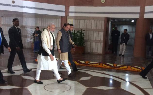 துணைத் தலைவர் ஹமீது அன்சாரி, மக்களவை சபாநாயகர் சுமித்ரா மகாஜன், பிரதமர் நரேந்திர மோடி ஆகியோர் வரவேற்றனர்.