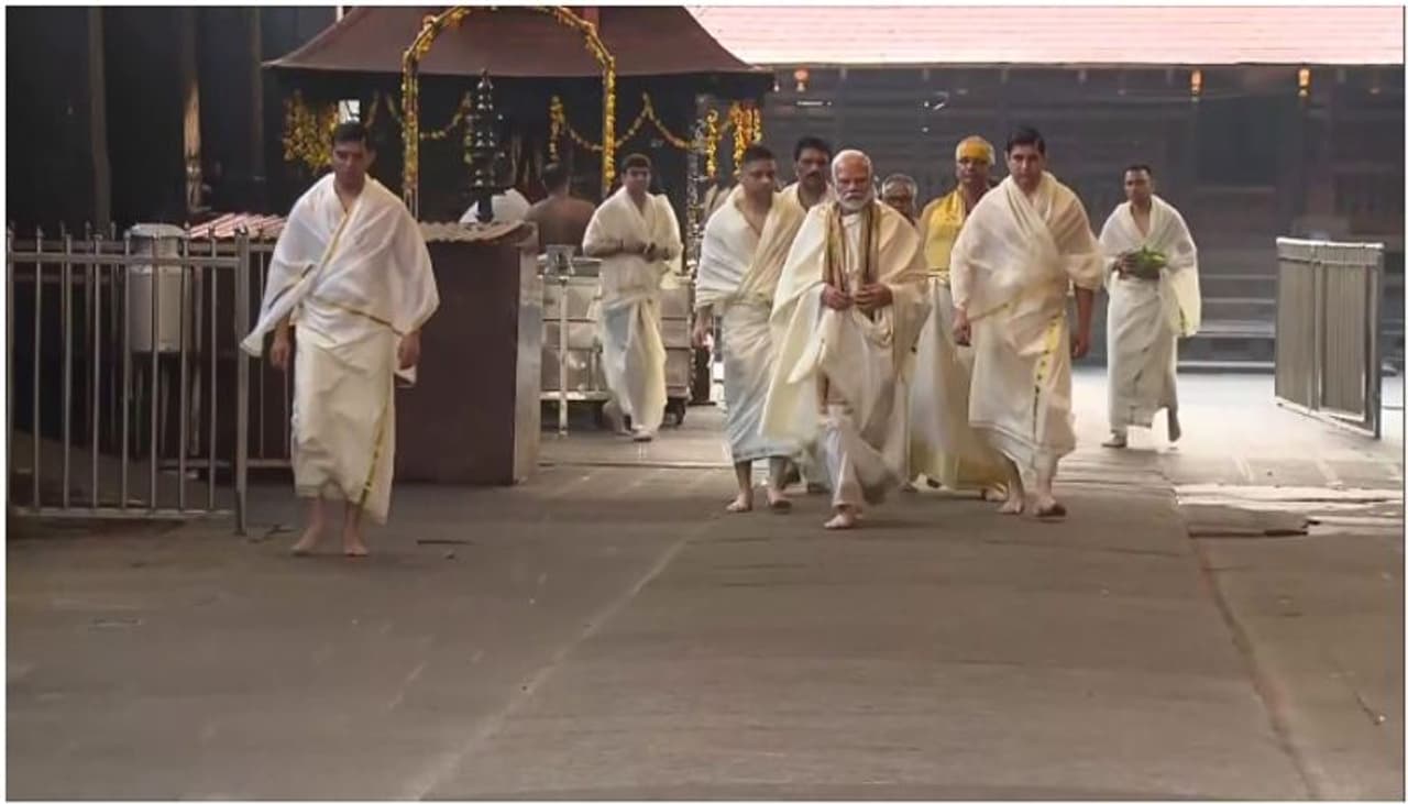கேரளா வந்துள்ள பிரதமர் மோடி பட்டுவேட்டி கட்டி வந்து குருவாயூர் கிருஷ்ணர் கோவிலுக்கு சென்று சாமி தரிசனம் செய்து வழிபாடு நடத்தினார்.