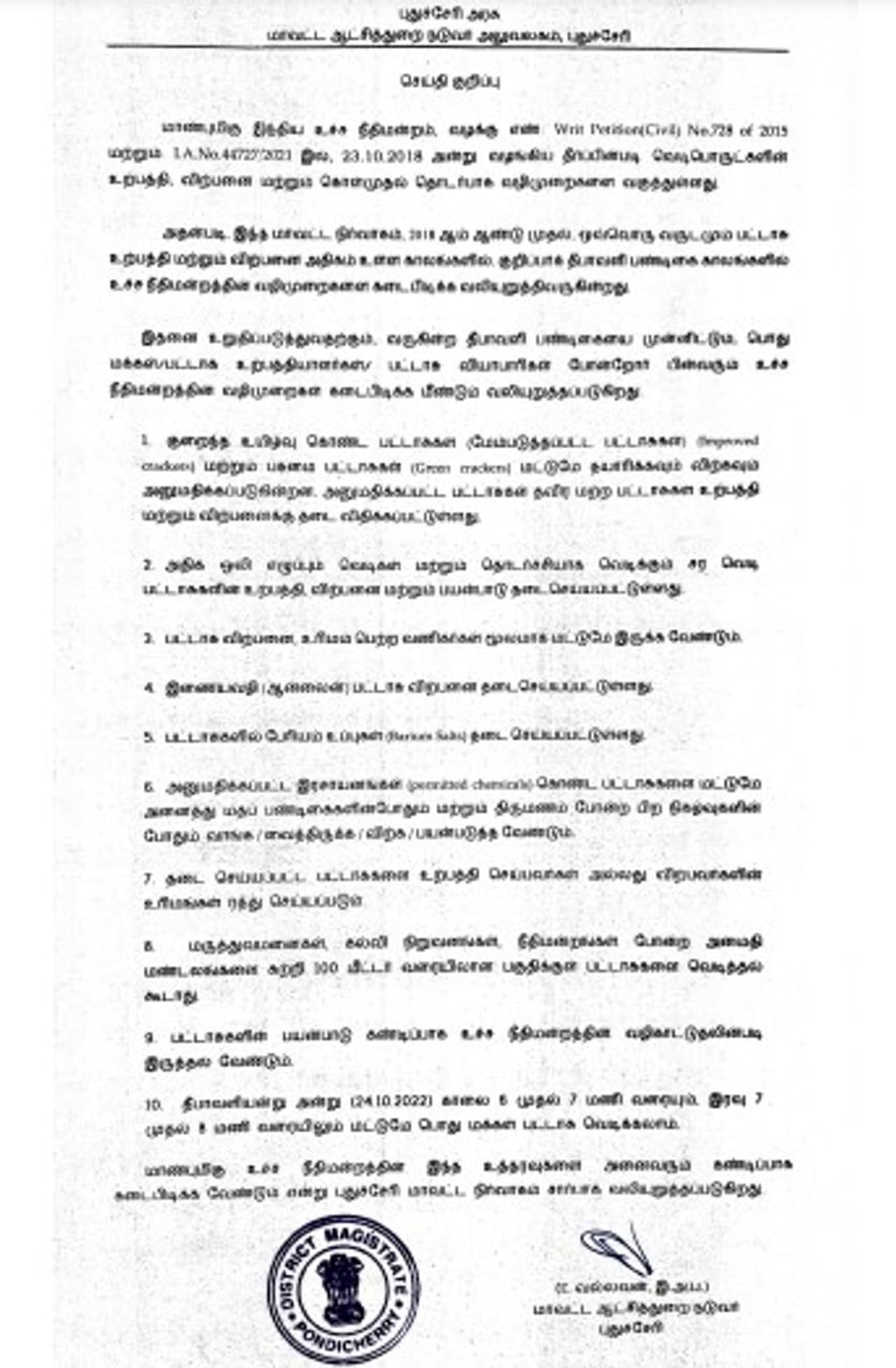 புதுச்சேரி ஆட்சியர் வல்லவன் வெளியிட்டுள்ள செய்திக்குறிப்பில், வருகின்ற தீபாவளி பண்டிகையை முன்னிட்டும், பொது மக்கள்/பட்டாசு உற்பத்தியாளர்கள்/ பட்டாசு வியாபாரிகள் போன்றோர் பின்வரும் உச்சநீதிமன்றத்தின் வழிமுறைகள் கடைபிடிக்க மீண்டும் வலியுறுத்தப்படுகிறது.