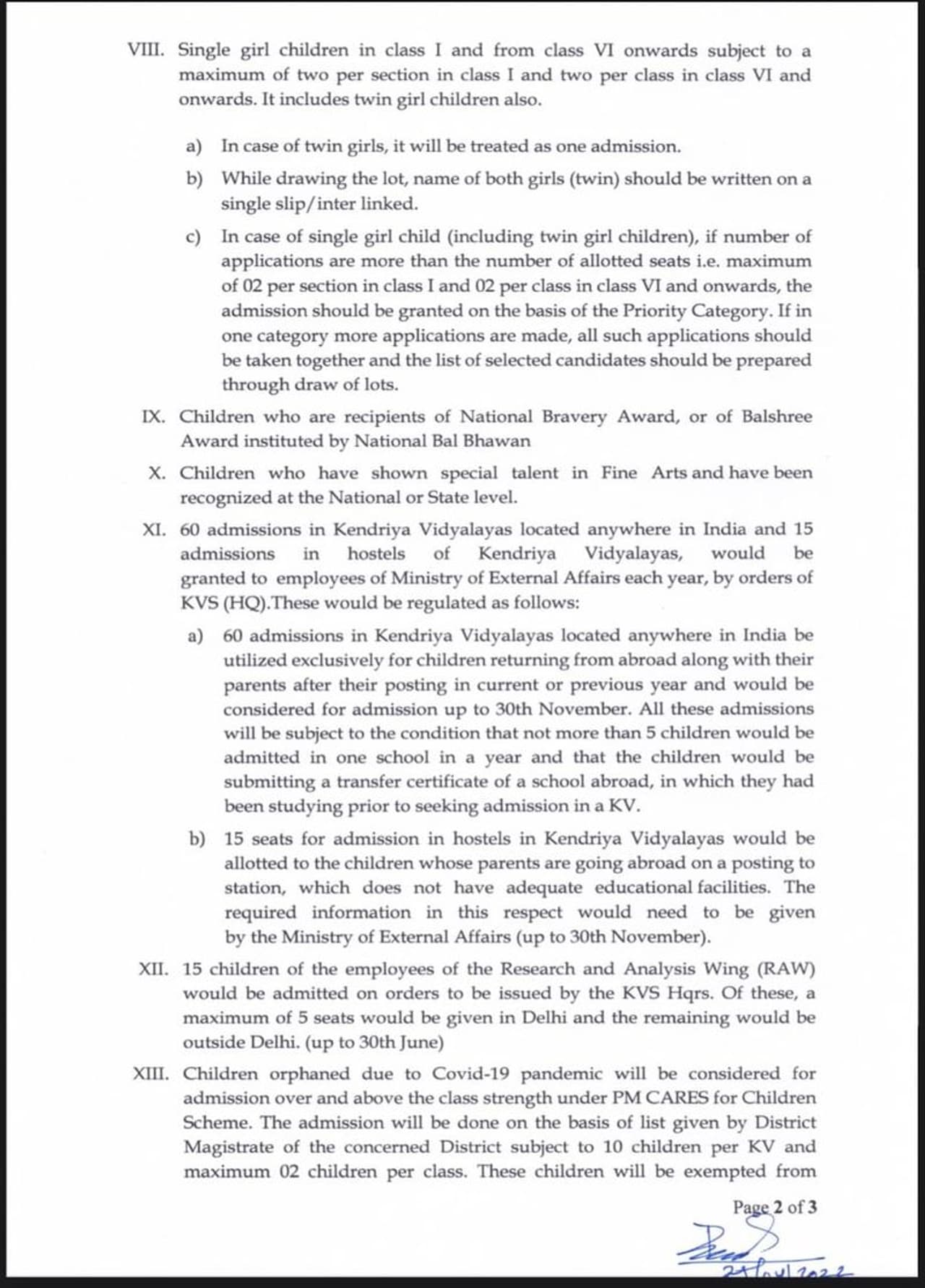இந்தநிலையில் தற்போது மத்திய அரசு மற்றொரு சுற்றறிக்கை வெளியிட்டுள்ளது. அதில் யார் யாருக்கு கேந்திர வித்யாலயா பள்ளியில் முன்னுரிமையில் ஒதுக்கீடு செய்யப்படவுள்ளது என்பதற்கான தகவல் இடம் பெற்றுள்ளது. ராணுவம், விமானப்படை, கடற்படை மற்றும் கடலோரக் காவல்படையின் ஒவ்வொரு கல்வி இயக்குநரகமும், பத்து மற்றும் பன்னிரெண்டாம் வகுப்புகளைத் தவிர, பாதுகாப்புத் துறையில் அமைந்துள்ள கேந்திரிய வித்யாலயாக்களில் ஒரு கல்வியாண்டில் தங்கள் பாதுகாப்புப் பணியாளர்களின் குழந்தைகளைச் சேர்க்க அதிகபட்ச பெயர்களை பரிந்துரைக்கலாம் என தெரிவிக்கப்பட்டுள்ளது. மேலும் கேந்திரவித்யாலயா பள்ளியில் பணியாற்றும் ஊழியர்களின் குழந்தைகள், மத்திய அரசு ஊழியர்களின் குழந்தைகள், பரம்வீர் சக்ரா, மகாவீர் சக்ரா, வீர் சக்ரா, அசோக் சக்ரா, கீர்த்தி சக்ரா & சௌர்ய சக்ரா, சேனா பதக்கம் (இராணுவம்) பெற்றவர்களின் குழந்தைகள் சேர்த்துக்கொள்வார்கள் என குறிப்பிடப்பட்டுள்ளது. மேலும் அரசாங்கத்தால் ஏற்பாடு செய்யப்பட்ட SGFI/CBSE/தேசிய/மாநில அளவிலான விளையாட்டுகளில் I, II & III நிலையைப் பெற்ற திறமையான விளையாட்டுக் குழந்தைகளையும் சேர்த்து கொள்ளலாம் என அந்த சுற்றறிக்கையில் தெரிவிக்கப்பட்டுள்ளது.