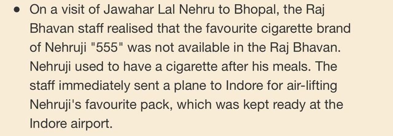 இதையடுத்து ராஜ் பவனில் தங்கவிருப்பதை அறிந்த ராஜ்பவன் ஊழியர்கள், நேருவுக்கு பிடித்தமான “555” பிராண்ட் சிகரெட் அங்கு இல்லாததை அறிந்திருந்தனர். சாப்பாடு சாப்பிட்ட பிறகு சிகரெட் பிடிக்கும் பழக்கும் நேருவுக்கு இருந்தது. 555 பிராண்ட் சிகரெட் ராஜ் பவனில் இல்லாததால், அதை வாங்க போபாலிலிருந்து இந்தூருக்கு தனி விமானம் சென்றதாக விநாயக் படாஸ்கர் தனது ராஜ் பவன் குறிப்பில் குறிப்பிட்டுள்ளார்.