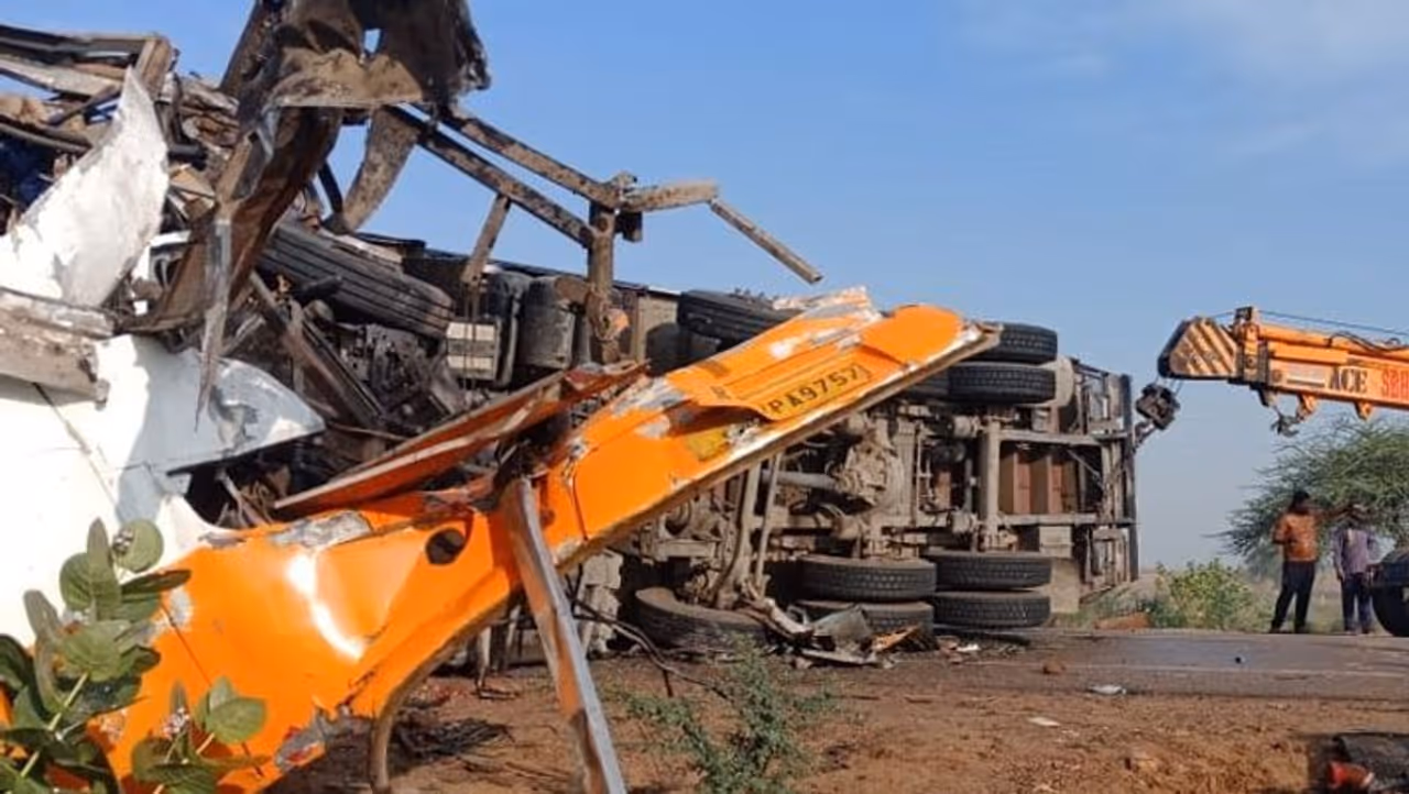 ராஜஸ்தான் மாநிலம் பிகானர் மாவட்டம் ஸ்ரீ துங்கர்கர் அருகே தேசிய நெடுஞ்சாலை இன்று காலை 30-க்கும் மேற்பட்ட பயணிகளுடன் பேருந்து சென்றுக்கொண்டிருந்தது. அப்போது, பின்னால் வேகமாக வந்த லாரி பேருந்து மீது பயங்கரமாக மோதியது. கண்ணிமைக்கும் நேரத்தில் நடந்த இந்த விபத்தில் இரண்டு வாகனங்களும் அப்பளம் போல் நொறுங்கின.