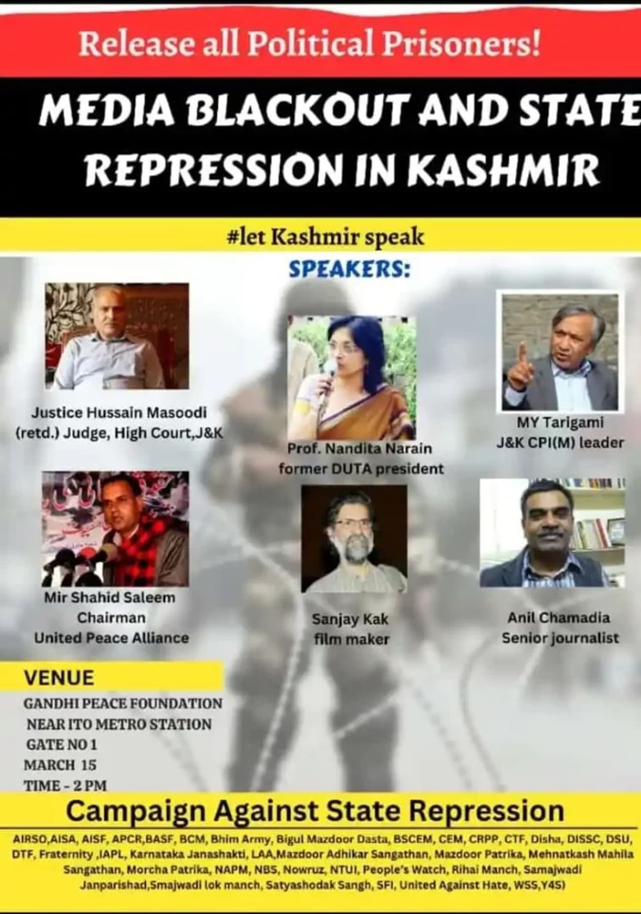 அனைத்து காஷ்மீர் அரசியல் கைதிகளையும் விடுவிக்க உள்ளிட்ட பல்வேறு கோரிக்கைகளை வலியுறுத்தி டெல்லியில் நாளை பேரணி நடைபெற உள்ளது. அனைத்து காஷ்மீர் அரசியல் கைதிகளையும் விடுவிக்க கோரியும், இந்திய சட்ட விரோதமாக ஆக்கிரமித்துள்ள ஜம்மு-காஷ்மீரில் ஊடகக் கட்டுப்பாடுகள் மற்றும் அடக்குமுறைகளை நீக்க கோரியும் டெல்லியில் நாளை (புதன்கிழமை) பேரணி நடைபெற உள்ளது.