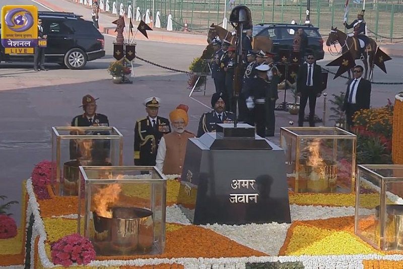 முன்னதாக டெல்லி இந்தியா கேட் பகுதியில், போரில் உயிர் தியாகம் செய்த வீரர்களின் நினைவாக அமைக்கப்பட்டுள்ள அமர்ஜவான் ஜோதியில் பிரதமர் மோடி மலர் வளையம் வைத்து மரியாதை செலுத்தினார். குடியரசு தின விழாவில் 25000-க்கும் மேற்பட்ட வீரர்கள் பாதுகாப்பு பணியில் ஈடுபட்டுள்ளனர்.