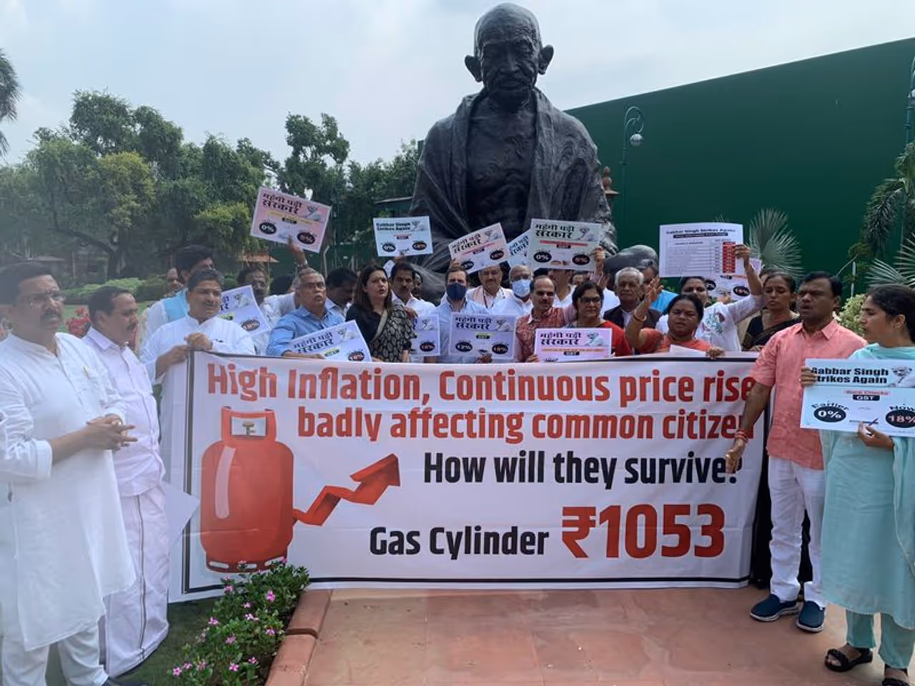 நாடாளுமன்ற மழைக்காலக் கூட்டத் தொடர் நேற்று தொடங்கி நடந்து வருகிறது. 2-வது நாளான இன்று காங்கிரஸ் உள்ளிட்ட எதிர்க்கட்சிகள் விலைவாசிஉயர்வு, ஜிஎஸ்டி வரி உயர்வு, சமையல் சிலிண்டர் விலை உயர்வு ஆகியவற்றுக்கு எதிராகப் நாடாளுமன்றத்தின் வளாகத்தில் போராட்டம் நடத்தினர்.