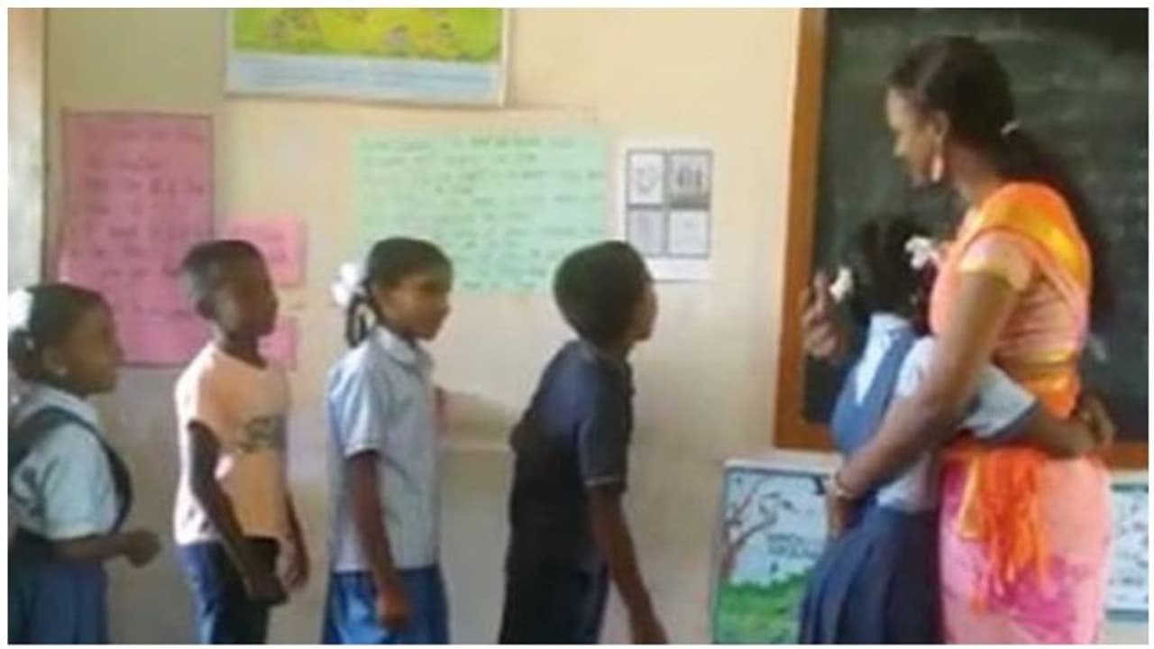 அப்போது, 5ம் வகுப்பு ஆசிரியை சுபாஷினி, மாணவர்களுக்கு கை கொடுத்தல், கைத் தட்டி நடனமாடி இருவரும் இடித்துக் கொள்ளுதல், கட்டிப்பிடித்தல், கை தட்டிக் கொள்ளுதல் ஆகிய செய்முறைகளை படங்களாக வகுப்பறையில் ஒட்டியிருந்தார்.