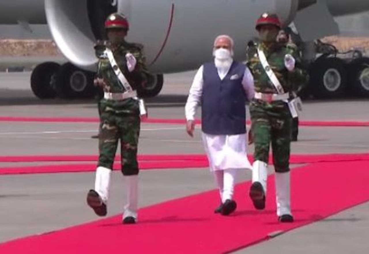 பிரதமர் நரேந்திர மோடி 15 மாதங்களுக்கு பிறகு முதல் வெளிநாட்டு சுற்றுப்பயணமாக வங்கதேசம் சென்றுள்ளார். இந்தியாவின் அண்டை நாடான வங்கதேசத்தின் 50வது சுதந்திர தின கொண்டாட்டத்தில் கலந்துகொள்ள வங்கதேசம் சென்றுள்ள பிரதமர் மோடிக்கு தலைநகர் டாக்காவில் சிவப்பு கம்பள வரவேற்பளிக்கப்பட்டது.