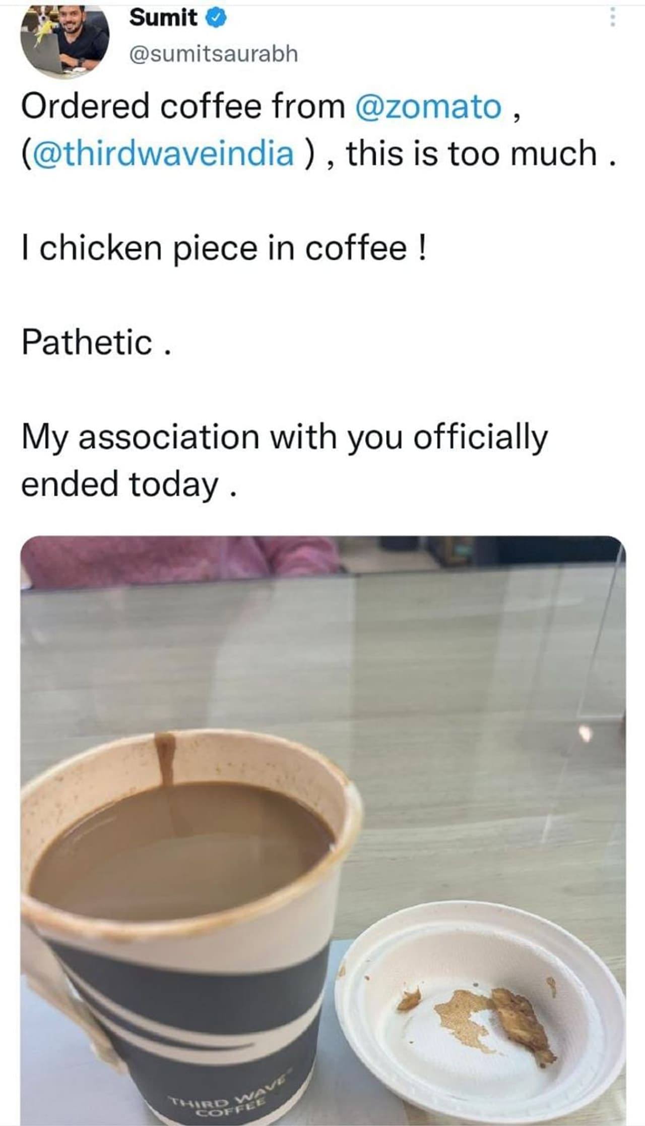 ஓட்டலில் இருந்து உணவுகளை வாங்கி சாப்பிடும் போது பெரும்பாலும் பல்லி, கரப்பான் பூச்சி உள்ளதாக புகார் கூற கேள்விபட்டிருப்போம்,ஆனால் ஜொமோட்டாவில் ஆர்டர் செய்த காபியில் சிக்கன் துண்டு இருந்ததாக வாடிக்கையாளர் கூறிய சம்பவம் பரபரப்பை ஏற்படுத்தியுள்ளது. டெல்லியை சேர்ந்த சௌரப் என்ற நபர், Zomato மூலம் காபி ஆர்டர் செய்துள்ளார். அந்த காபி வீட்டிற்கு டெலிவரி செய்யப்பட்ட நிலையில் அதனை தனது மனைவியோடு சேர்ந்து சௌரப் அருந்தியுள்ளார். அப்போது காபியில் ஏதோ ஒன்று தட்டுப்பட எடுத்துப்பார்த்துள்ளார். சிக்கன் பீஸ் போல் இருந்தது கண்டு அதிர்ச்சி அடைந்த சௌரப் உடனே காபியோடு அருகில் சிக்கன் துண்டு போன்ற மர்ம பொருளை வைத்து புகைப்படத்தை தனது டுவிட்டரில் பகிர்ந்துள்ளார். அதில் third wave cofee-ல் இருந்து காபி ஆர்டர் செய்தேன் அதில் சிக்கன் துண்டு இருந்தது வேதனை அளிப்பதாக பகிர்ந்திருந்தார்.