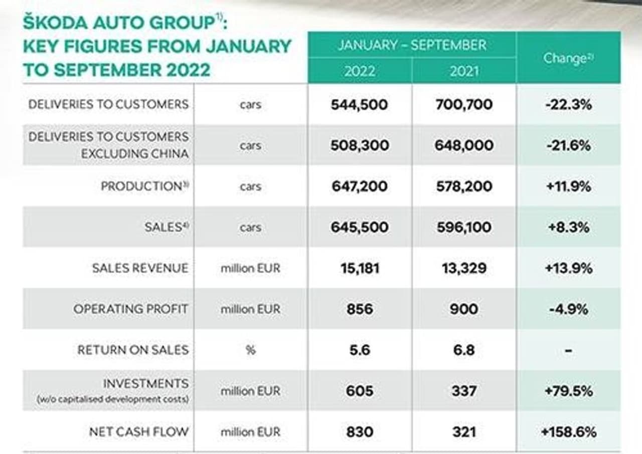 இந்தியாவில் எங்கள் டெலிவரிகள் ஏற்கனவே முந்தைய ஆண்டின் முடிவைத் தாண்டிவிட்டன. இந்த முக்கியமான வளர்ச்சி சந்தையில் நாங்கள் இதை உருவாக்க விரும்புகிறோம், என்று ஸ்கோடா ஆட்டோ வாரியத்தின் விற்பனை மற்றும் சந்தைப்படுத்தல் உறுப்பினர் மார்ட்டின் ஜான் தெரிவித்துள்ளார். ஸ்கோடாவின் உலகளாவிய விற்பனை ஜனவரி முதல் செப்டம்பர் வரையிலான 544,500 வாகனங்கள் ஆண்டுக்கு 22.3% குறைந்துள்ளது. இதுக்குறித்த ஸ்கோடா நிறுவனத்தின் அறிக்கையில், உலகளாவிய நிகழ்வுகள் காரணமாக தற்போதைய விநியோக திரிபு; உக்ரைனில் நடந்த போர், மூலப்பொருட்கள் மற்றும் எரிசக்தி விலைகளில் குறிப்பிடத்தக்க அதிகரிப்பு, குறைக்கடத்திகளின் தற்போதைய பற்றாக்குறை மற்றும் நிலையற்ற விநியோகச் சங்கிலிகள் ஆகியவை செக் கார் தயாரிப்பாளரின் காலாண்டு முடிவுகளைப் பெரிதும் பாதிக்கின்றன.