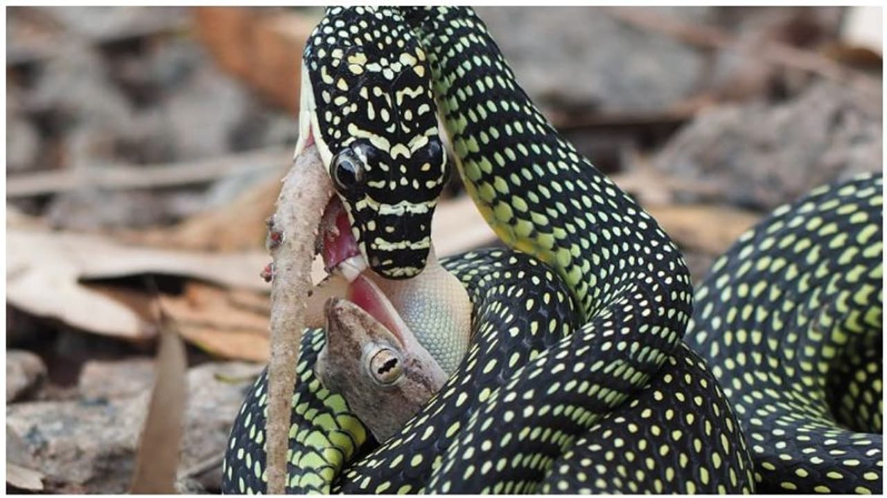 பச்சை நிறத்தில் கருப்பு கோடுகள் உள்ளது போல் காணப்படும் இந்த கெக்கோ ஸ்னேக் உலகில் மிக, மிக அழிந்துவரும் ஊர்வன உயிரினத்தில் உள்ளன.