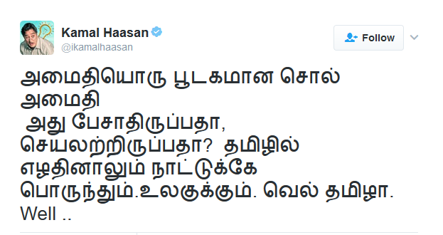 அதன்பின், “ அமைதி.. ஒரு பூடகமான சொல், அமைதி... அது பேசாதிருப்பதா?, செயலற்றிருப்பதா?; தமிழலில் எழுதினாலும் நாட்டுக்கே பொருந்தும் உலகுக்கே.. வெல் தமிழா'' என பதிவிட்டார்.