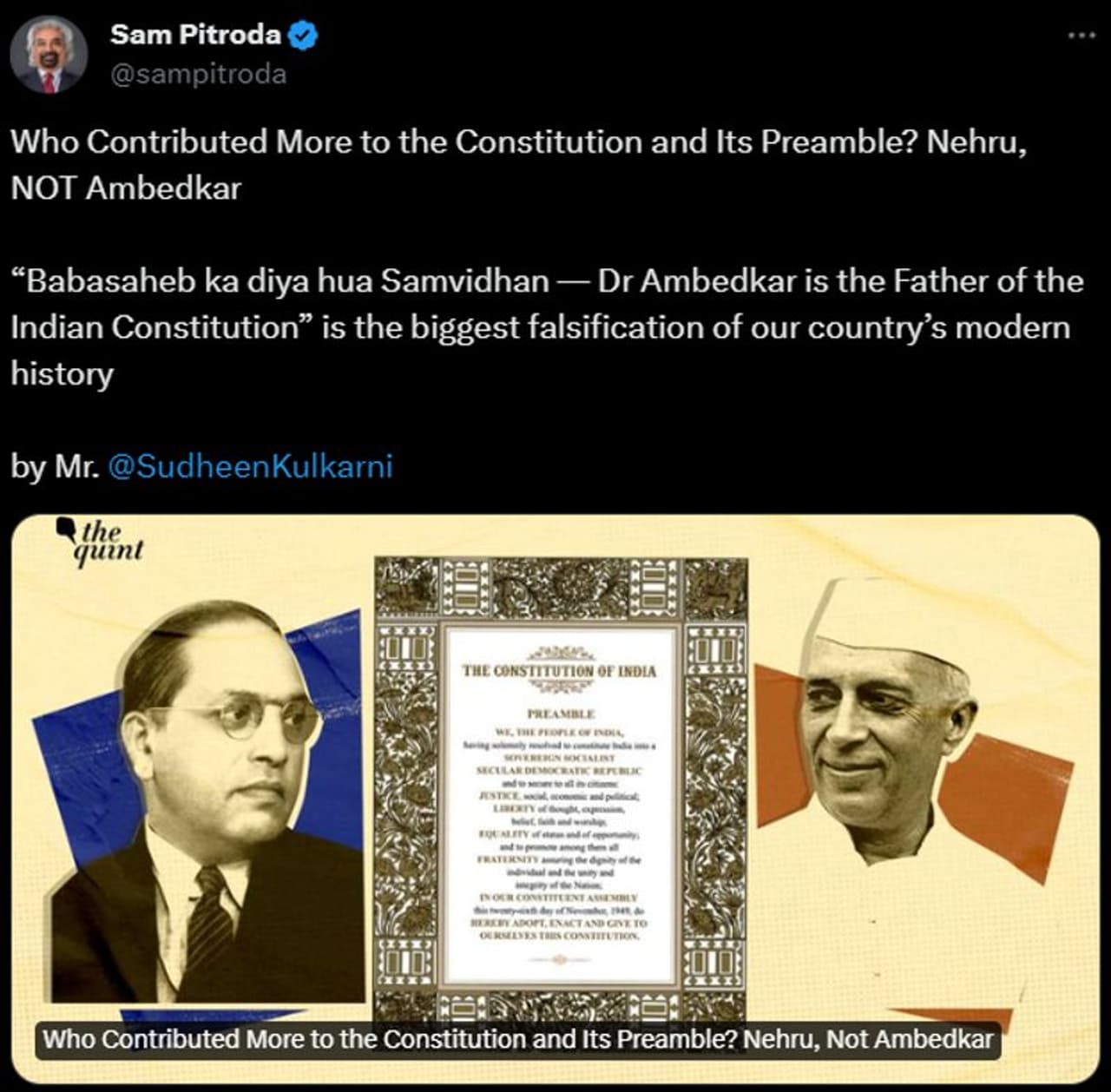 இந்திய அரசியலமைப்பு சட்டத்தை உருவாக்கியதில் அதிக பங்காற்றியவர் அம்பேத்கர் இல்லை நேரு என்கிற சர்ச்சைக்குரிய கருத்தை காங்கிரஸ் நிர்வாகி ஒருவர் கூறி இருப்பது சர்ச்சையாகி இருக்கிறது.