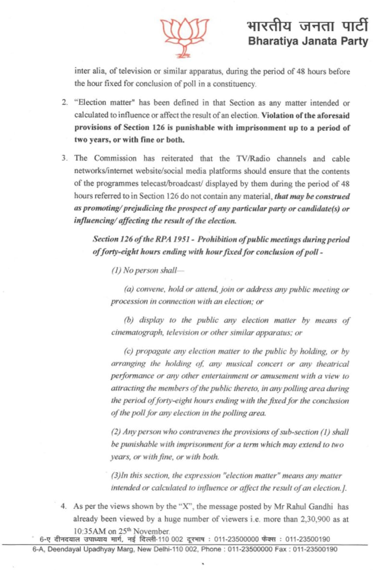 இந்த சூழலில் காங்கிரஸ் கட்சி தலைவர் ராகுல் காந்தியின் எக்ஸ் (ட்விட்டர்) தளத்தை முடக்குமாறு ராஜஸ்தான் தேர்தல் ஆணையத்திற்கு கடிதம் ஒன்றை தற்பொழுது எழுதியுள்ளது பாஜக. அந்த கடிதத்தில் "தேர்தல் நடைபெறுவதற்கு 48 மணி நேரத்திற்கு முன்பாகவே பிரச்சாரங்கள் மற்றும் பிற தேர்தல் சார்ந்த விஷயங்களை அந்தந்த கட்சிகள் நிறுத்திக்கொள்ளவேண்டும் என்பது தான் தேர்தல் ஆணைய விதி".