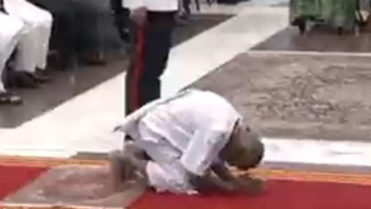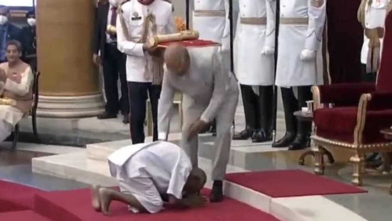 வெள்ளை வேட்டி, வெள்ளை சட்டை அணிந்து இருந்த நிலையில், விருதை பெற்றுக் கொள்ள அழைக்கப்பட்டதும், சுவாமி சிவானந்தா வெறும் கால்களுடன் விருது வழங்கும் மேடையை நோக்கி கம்பீரமாக நடந்து சென்றார். வழியில் பிரதமர் மோடியை பார்த்தும், தரையில் முழங்காலிட்டு வணக்கம் செலுத்தினார். இதை பார்த்து அதிர்ந்து போன பிரதமர் மோடி, பட்டென எழுந்து நின்று தரையில் தனது கைகளை தொட்டு இருமுறை வணங்கினார்.