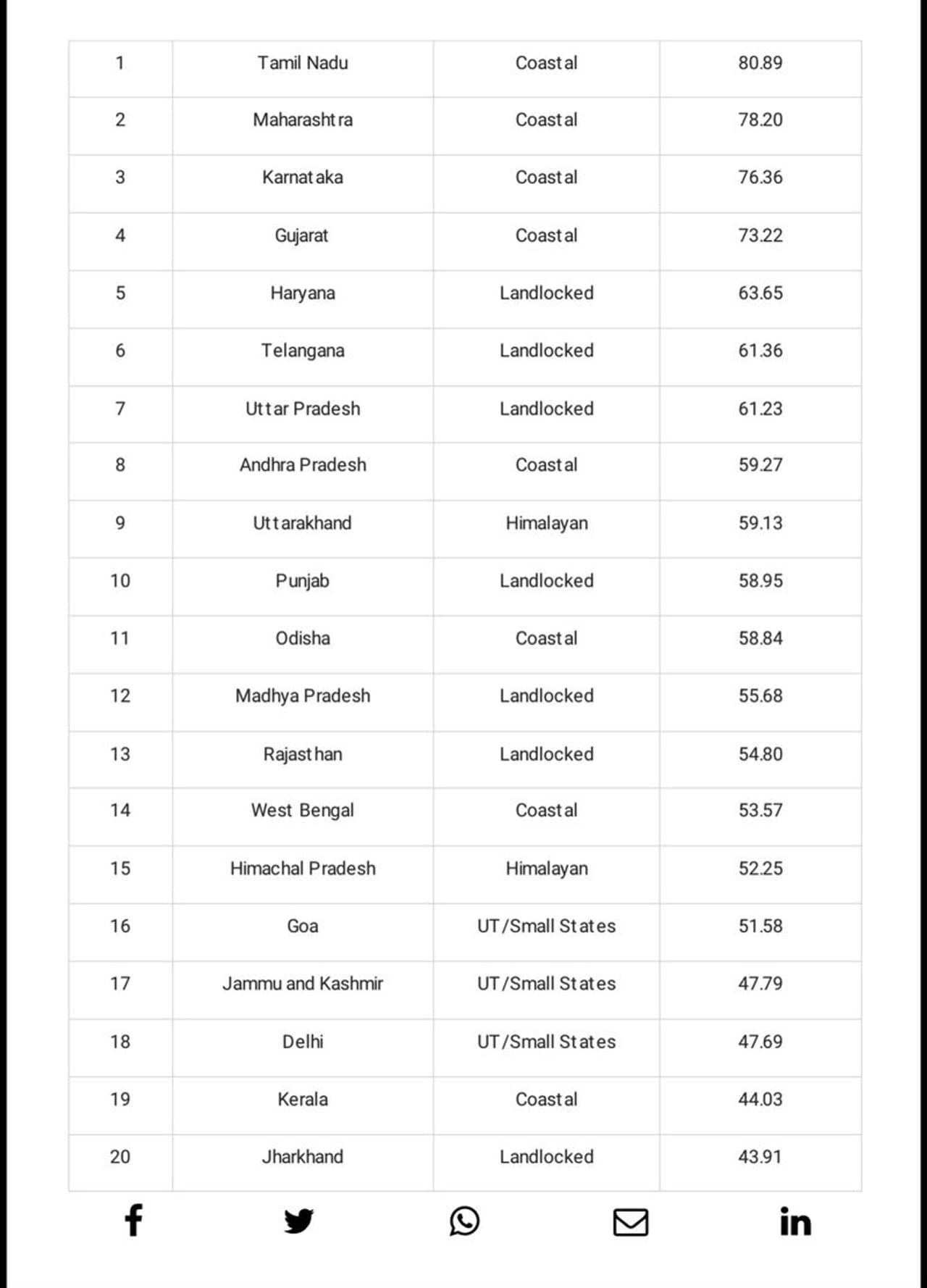 இந்த பட்டியலில் 80.89 புள்ளிகளைப் பெற்றிருக்கும் தமிழ்நாடு முதல் இடத்தை எட்டி சாதனை படைத்துள்ளது. 78.20 புள்ளிகளைப் வசப்படுத்திய மகாராஷ்டிர மாநிலம் இரண்டாவது இடத்தில் இருக்கிறது. கர்நாடகா 76.36 புள்ளிகளுடன் மூன்றாம் இடத்தில் உள்ளது. முதல் இரண்டு ஆண்டுகளில் முதலிடத்தைப் பெற்றவந்த குஜராத் மாநிலம் 73.22 புள்ளிகளுடன் 4வது இடத்துக்கு பின்தங்கிவிட்டது.