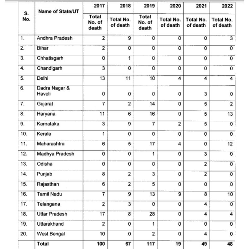 தமிழகம், கேரளா, கர்நாடகா மற்றும் தெலுங்கானா உள்ளிட்ட நாட்டின் 20 மாநிலங்களில் இந்த ஆண்டில், பாதாள சாக்கடை மற்றும் கழிவுநீர் தொட்டிகளில் உள்ள கழிவுகளை அகற்றும் போது 48 பேர் உயிரிழந்துள்ளார்கள். இதில் அதிகபட்சமாக ஹரியானா மாநிலத்தில் 13 பேரும், மகாராஷ்டிரா மாநிலத்தில் 12 பேரும், 3வதாக தமிழகத்தில் 10 பேரும் உயிரிழந்துள்ளதாக தெரிவிக்கப்பட்டுள்ளது. இந்த பட்டியலில் தமிழகம் 3வது இடம் பெற்றுள்ளது அதிர்ச்சியை ஏற்படுத்தி உள்ளது.