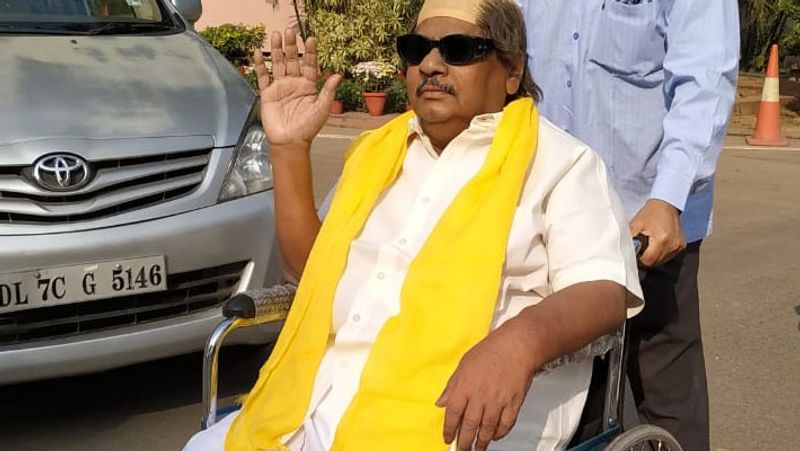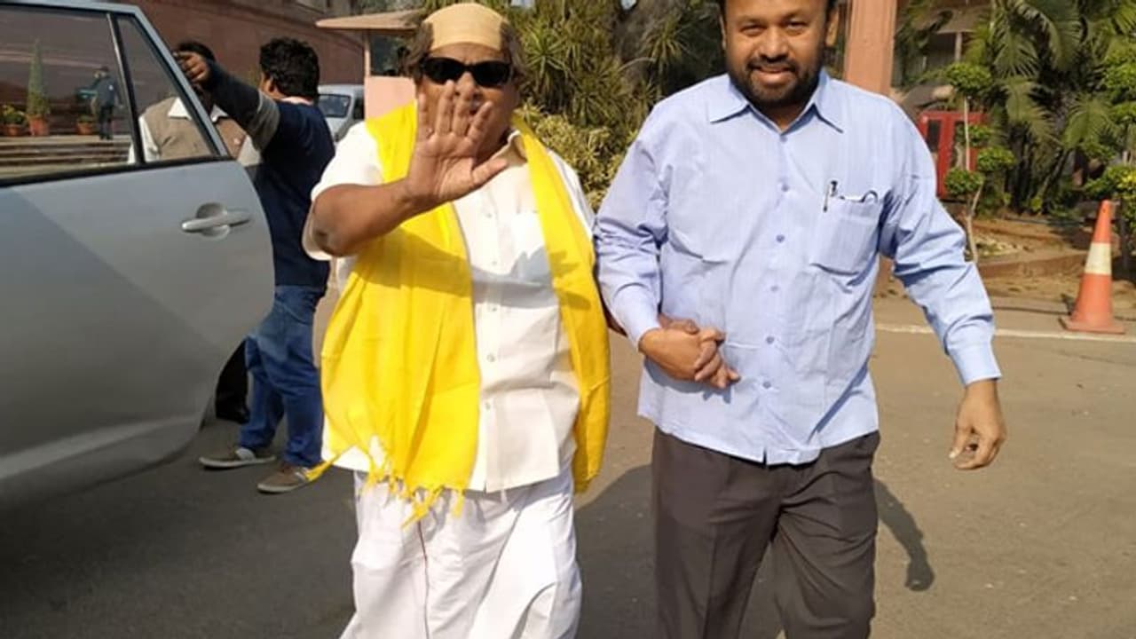 மறைந்த முன்னாள் முதல்வர் கருணாந்தி வேடமிட்டு தெலுங்குதேச எம்.பி சிவபிரசாத் நாடாளுமன்ற வளாகத்தின் முன் போராட்டத்தில் ஈடுபட்டார்.