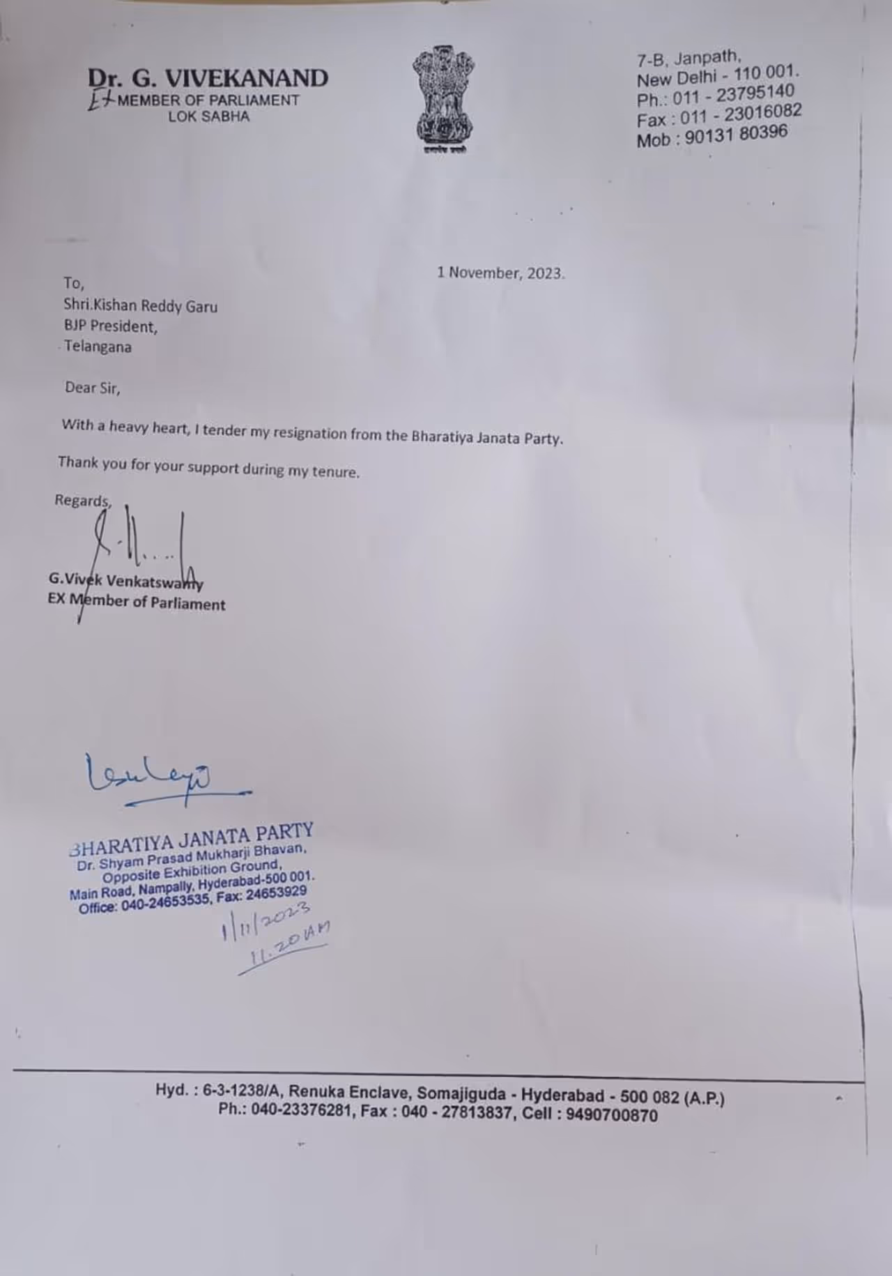 தெலங்கானா பாஜக மூத்த தலைவர் விவேகானந்த் கட்சியில் இருந்து விலகுவதாக ராஜினாமா கடிதம் அளித்துள்ளார்