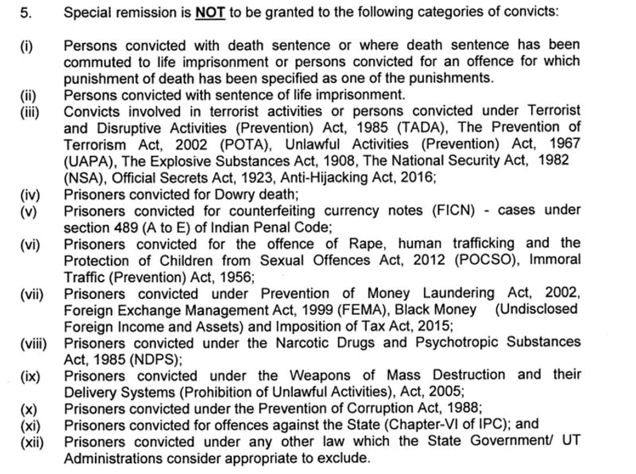 6-வது விதியில் பாலியல் பலாத்காரத்தில் குற்றவாளிகள் என்று நிரூபிக்கப்பட்டவர்கள், ஆட்கடத்தல், போக்சோ சட்டத்தில் குற்றவாளி என நிரூபிக்கப்பட்டு தண்டனை பெற்றவர்கள் ஆகியோரை விடுவிக்கக்கூடாது என்று தெளிவாக விளக்கப்பட்டுள்ளது.