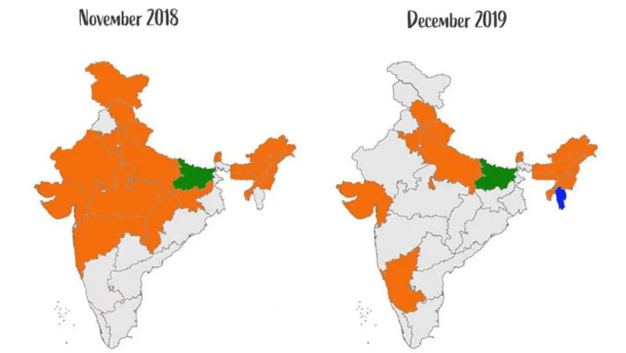பிரதமர் மோடியும் அமித்ஷாவும் இணைந்து இந்திய அரசியல் வரைபடத்தில் புதிய மாற்றத்தைக் கொண்டு வந்தனர் என்றே கூற வேண்டும். இந்தியா முழுவதும் நீல நிறமாக (காங்கிரஸ்) காட்சியளித்த மாநிலங்களை, 2014-ம் ஆண்டு இவர்கள் இருவரும் காவி நிறமாக (பா.ஜ.க) மாற்றினர். அரசியல் வரலாற்றில் இவர்கள் செய்த மாற்றம் அனைத்துத் தரப்பினரையும் உற்றுக் கவனிக்க வைத்தது. 2018-ம் ஆண்டு பாஜக ஆளாத மாநிலங்கள் எவை என பட்டியலிடும் அளவுக்கு அக்கட்சி முன்னேறியது. அதில், தமிழகம், கர்நாடகா, கேரளா, மிசோரம், பஞ்சாப், ஒடிசா, மேற்குவங்கம், தெலுங்கானா ஆகிய மாநிலங்களில் மட்டுமே பாஜக கூட்டணி ஆட்சியில் இல்லாமல் இருந்தது.