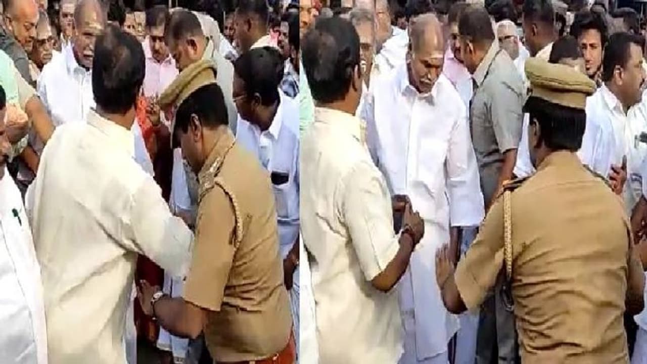 புதுச்சேரி முதல்வரை உள்துறை அமைச்சரின் பாதுகாவலர் தள்ளி விட்டது தொடர்பான வீடியோ சமூக வலைதளத்தில் வைரலாக பரவியதை அடுத்து அமைச்சரின் பாதுகாவலர் மீது நடவடிக்கை பாய்ந்துள்ளது. புதுச்சேரியை அடுத்த வில்லியனூரில் கோகிலாம்பிகை கோயில் தேரோட்டம் நடைபெற்றது. அப்போது புதுச்சேரி துணைநிலை ஆளுநர் தமிழிசை சௌந்தரராஜன், முதல்வர் ரங்கசாமி, உள்துறை அமைச்சர் நமச்சிவாயம் ஆகியோர் கலந்து கொண்டு தேரை வடம்பிடித்து இழுத்து தொடங்கி வைக்க இருந்தது. இதற்காக புதுச்சேரி துணைநிலை ஆளுநர் தமிழிசை சவுந்தரராஜன், முதல்வர் ரங்கசாமி, உள்துறை அமைச்சர் நமச்சிவாயம் ஆகியோர் தேரை வடம்பிடித்து இழுத்து தொடங்கி வைக்க வந்துள்ளனர். அப்போது கூட்டம் அதிகமானதால் பாதுகாவலர்கள் போராட்டத்திற்கு பின்னர் ஆளுநரையும், முதல்வரையும் அழைத்து வருகிறார்கள். அதன் பின்னே உள்துறை அமைச்சர் நமச்சிவாயம் வந்து கொண்டிருக்கிறார்.