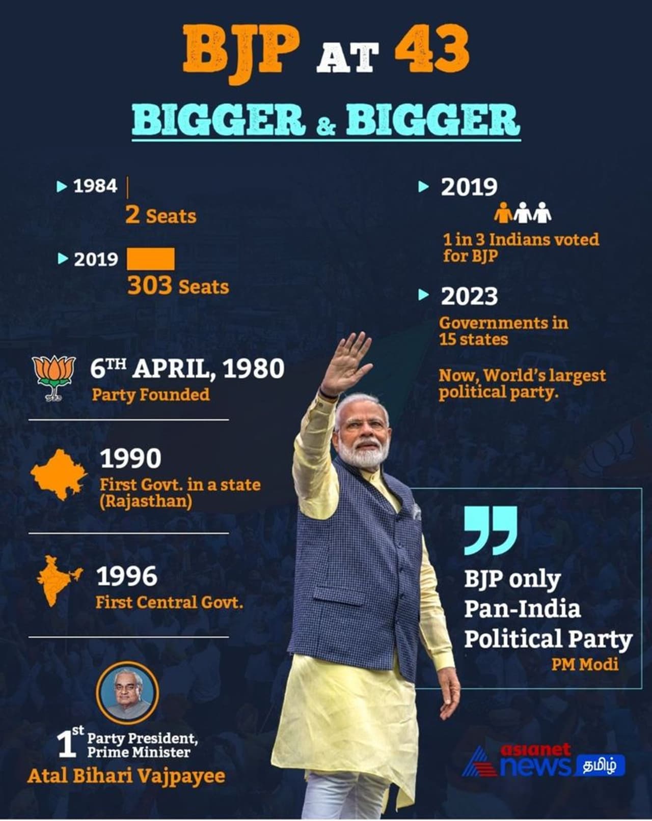43வது ஆண்டில் அடி எடுத்து வைக்கும் பாஜக நாட்டின் மிகப்பெரிய கட்சியானது எப்படி என்பது குறித்து விளக்குகிறது இந்த செய்தித்தொகுப்பு. சியாமா பிரசாத் முகர்ஜியால் இந்து தேசியவாத கொள்கையை வளர்ப்பதற்காக, 1951 ஆம் ஆண்டு பாரதிய ஜன சங் நிறுவப்பட்டது. பின்னர் 1980 ஆம் ஆண்டு ஏப்ரல் 6 ஆம் தேதி பாரதிய ஜன சங்கத்தின் தலைவர்களும் தொண்டர்களும் இணைந்து, அடல் பிகாரி வாஜ்பாயைத் தலைவராகக் கொண்ட பாரதிய ஜனதா கட்சி என்ற புதிய கட்சியை உருவாக்கினர். 1984 ஆம் ஆண்டு டெல்லியில் நடந்த சீக்கியர்களுக்கு எதிரான வன்முறையை பாஜக வெளிப்படையாகக் கண்டித்தது.