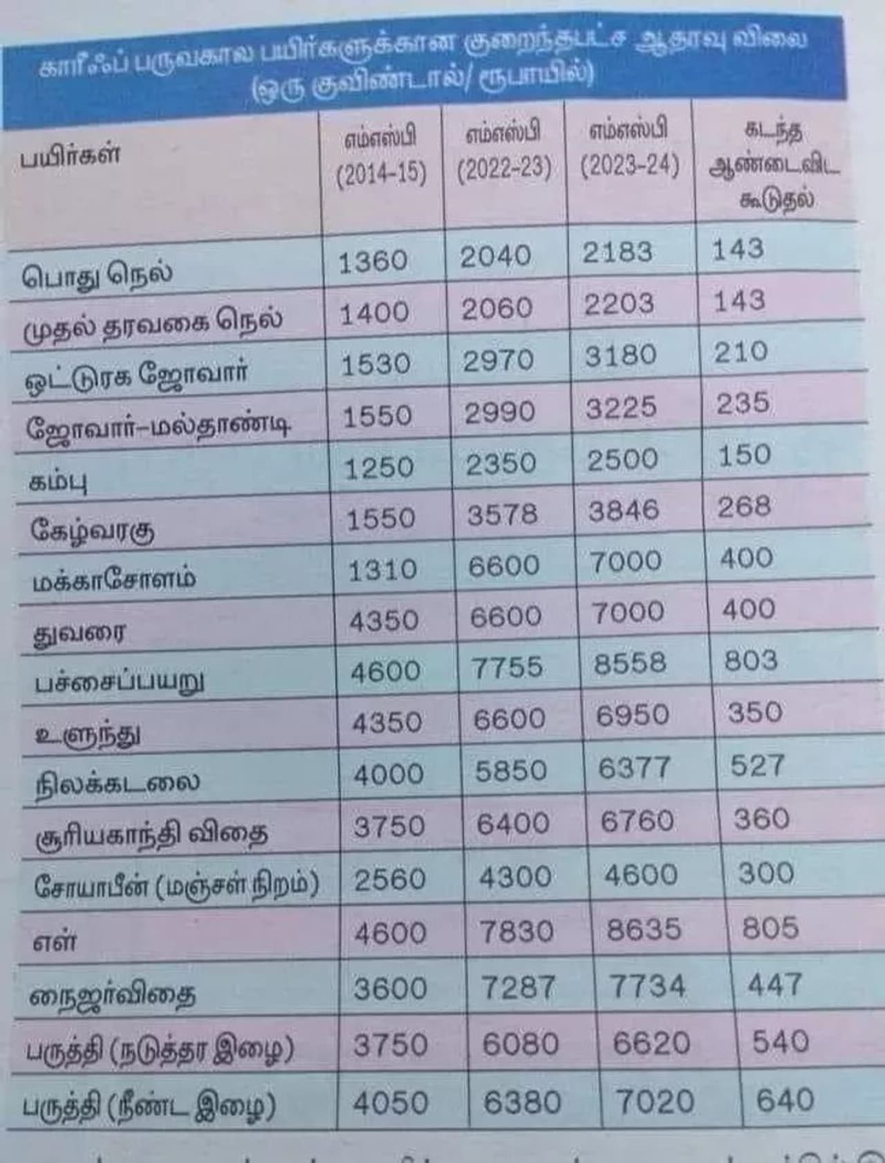 2018-19ஆம் ஆண்டு மத்திய பட்ஜெட்டில், உற்பத்தி விலையைவிட குறைந்தபட்ச ஆதரவு விலை ஒன்றரை மடங்குக்கு கூடுதலாக இருக்க வேண்டும் என்று அறிவிக்கப்பட்டதன் அடிப்படையில் விவசாயிகளுக்கு நியாயமான விலை கிடைக்கும் வகையில், 2023-24-ஆம் ஆண்டுக்கான கரீஃப் சந்தைப்பருவ குறைந்தபட்ச ஆதரவு விலை உயர்த்தப்பட்டுள்ளதாக தெரிவிக்கப்பட்டுள்ளது.