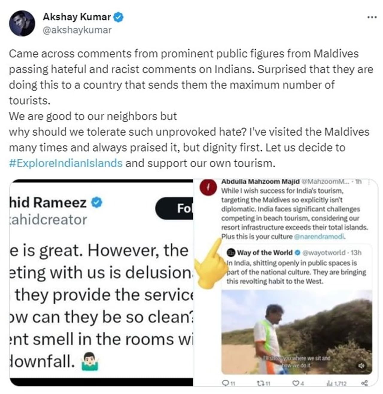 நடிகர் அக்ஷய் குமார் மாலத்தீவு தலைவர்கள் கூறிய கருத்துகளின் ஸ்கிரீன் ஷாட்களைப் பகிர்ந்து, பிரதமர் மோடி மீதுவெறுப்பு தூண்டப்பபடுகிறது என்று சாடியுள்ளார்.