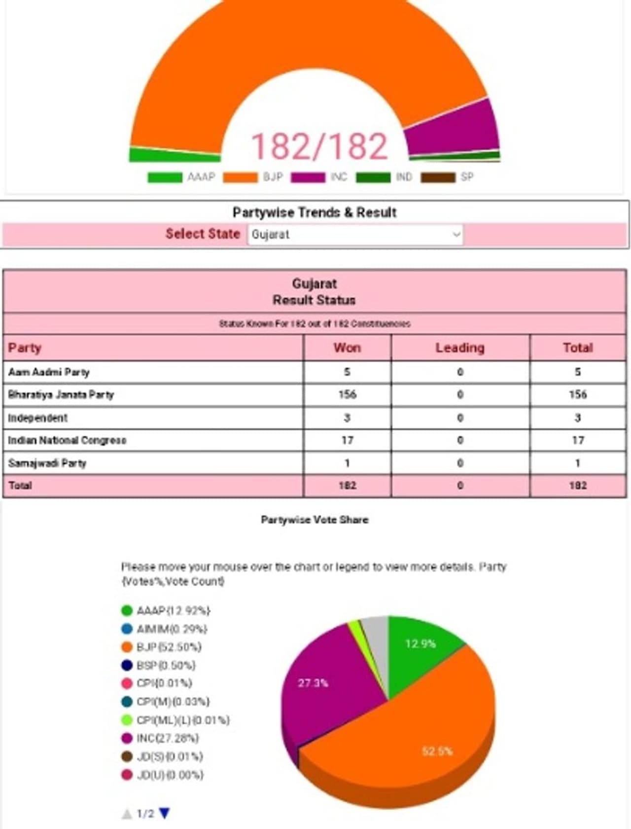 குஜராத் சட்டசபைத் தேர்தலில் 182 தொகுதிகளில் பாஜக 156 இடங்களில் வென்று இமாலய வெற்றி பெற்றது. இதன் மூலம் குஜராத் மாநிலத்தில் இதுவரை எந்தக் கட்சியும் வெல்லமுடியாத அளவுக்கு அதிகமான தொகுதிகளை பாஜக கைப்பற்றியது. கடந்த 1985ம் ஆண்டு காங்கிரஸ் கட்சி 145 இடங்களில் வென்றதுதான் சாதனையாக இருந்தது.