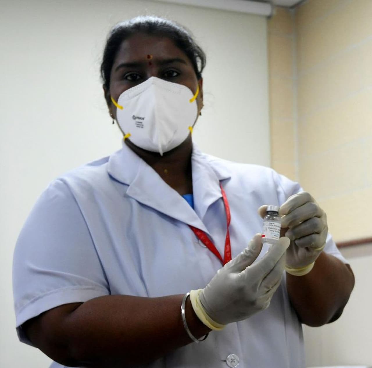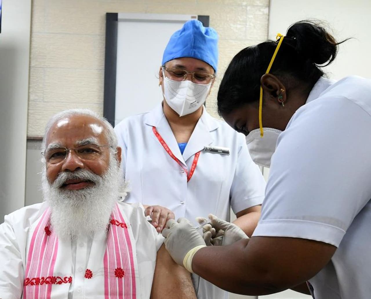 இந்தியாவின் பாரத் பயோடேக் நிறுவனம் தயாரித்த கோவோக்சின் தடுப்பு மருத்தை பிரதமருக்கு, புதுச்சேரியைச் சேர்ந்த செவிலியர் நிவேதாவும், கேரளாவைச் சேர்ந்த செவிலியரான ரோசாமா அனில் என்பவரும் செலுத்தினர்.