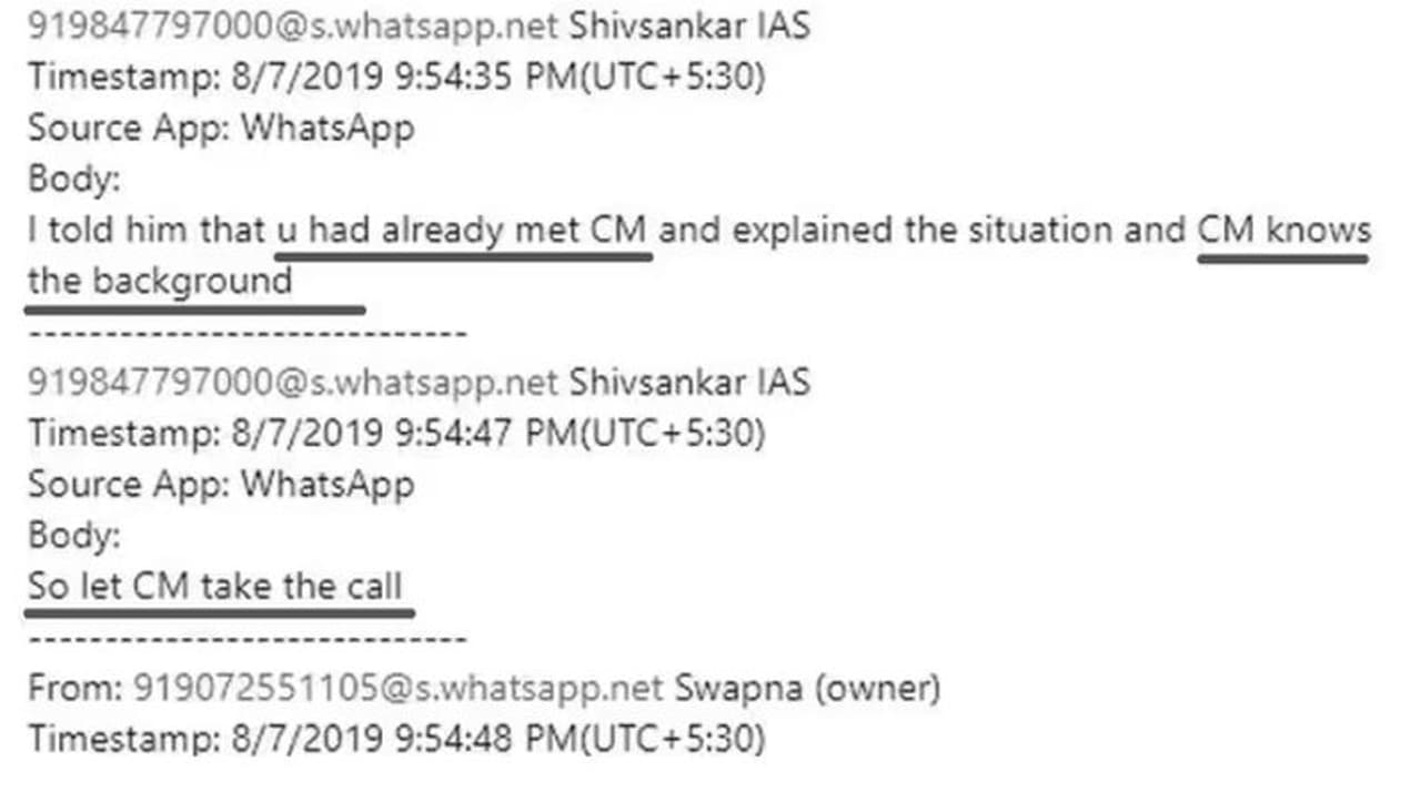 ஸ்வப்னா, முதல்வர் பினராயி விஜயன் மற்றும் முன்னாள் முதன்மை செயலாளர் எம். சிவசங்கருக்கு இடையிளான உரையாடல் வெளியாகி இருக்கிறது. தற்போது, சிவசங்கர் லைஃப் மிஷன் மோசடி வழக்கில் கைது செய்யப்பட்டு அமலாக்கத்துறை பாதுகாப்பில் சிறையில் இருக்கிறார். இவர்களது உடையாடலின் முக்கிய பரிமாற்றங்களை இங்கே காணலாம்.
