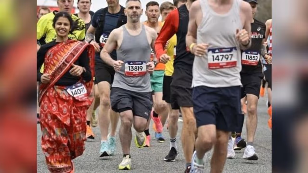 இங்கிலாந்தில் உள்ள ஒடிசா பெண் ஒருவர் ஞாயிற்றுக்கிழமை மான்செஸ்டரில் சம்பல்புரி கைத்தறி புடவை அணிந்து 42.5 கிமீ மாரத்தான் ஓடினார். சிவப்பு நிற புடவை மற்றும் ஆரஞ்சு நிற ஸ்னீக்கர்களை அணிந்த 41 வயதான மதுஸ்மிதா ஜெனா தாஸ் 4 மணி நேரம் 50 நிமிடங்களில் மாரத்தானை முடித்தார். மதுஸ்மிதா ஜெனா தாஸ் மற்ற பங்கேற்பாளர்களுடன் மாரத்தானில் பங்கேற்பதைக் காட்டும் நிகழ்வின் புகைப்படங்களைப் பகிரபட்டுள்ளது.