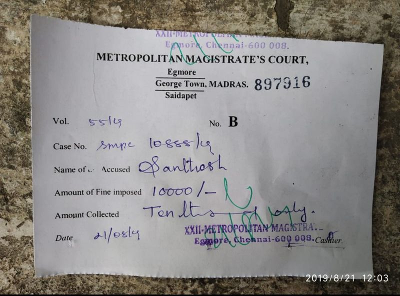 அதன்படி ஆகஸ்ட் மாதம் 21 ஆம் தேதியான இன்று சந்தோஷ் என்ற நபருக்கு மது அருந்திவிட்டு வாகனம் ஓட்டியதற்காக 10 ஆயிரம் ரூபாய் அபராதம் விதித்து அதற்கான ரசீதை கொடுத்து உள்ளனர்.இதற்கான அவரது தொகையை எக்மோர், எக்மோர் டவுன், சைதாப்பேட்டை நீதிமன்றம் .. இதில் ஏதாவது ஒரு இடத்திற்கு சென்று அபராத தொகையை செலுத்த வேண்டும். அவ்வாறு செலுத்தியபின் பெறப்பட்ட கட்டண ரசீது உங்களுக்காக...